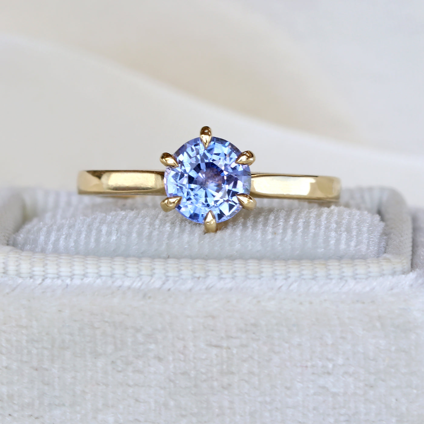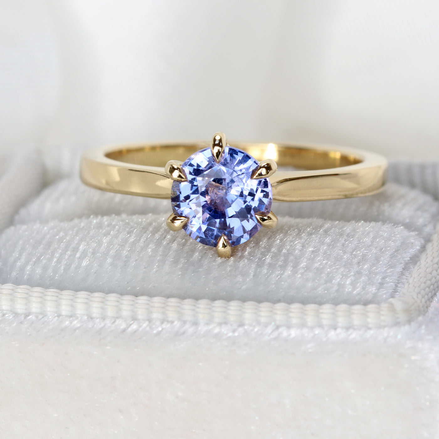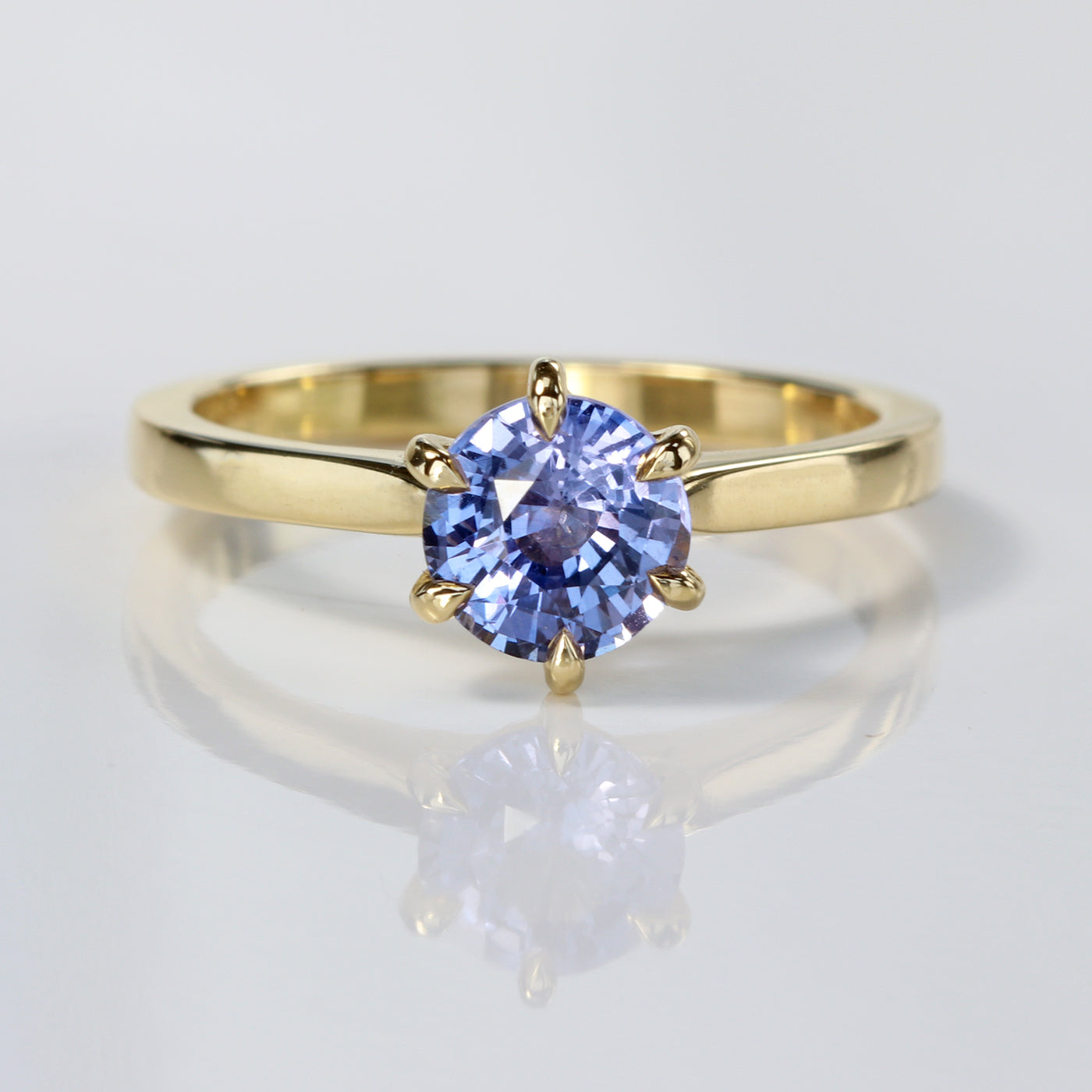 This handmade 18ct gold solitaire engagement ring features a natural unheated Ceylon sapphire in a distinctive periwinkle-lavender tone. Weighing 1.25 carats and measuring 6.3 mm, the sapphire shows a gentle mix of blue and soft purple that shifts beautifully in the light, giving the gem its unique colour.