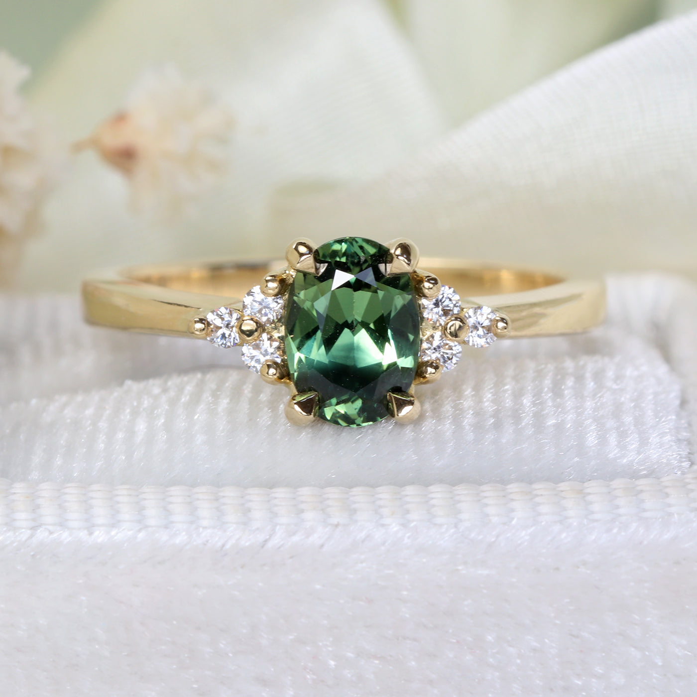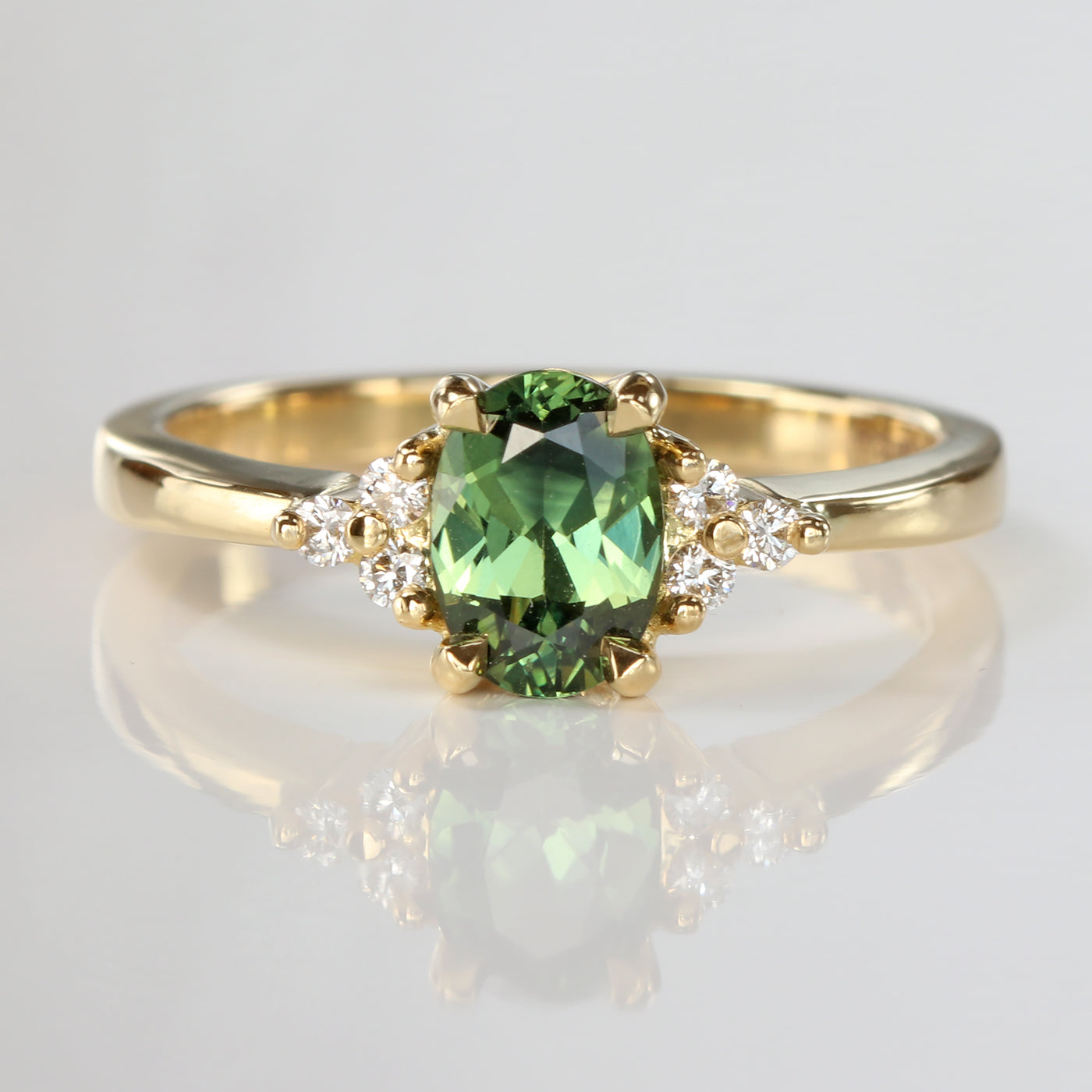 A cluster of small Canadian diamonds sits on each side of the centre sapphire, adding gentle brightness to the setting.