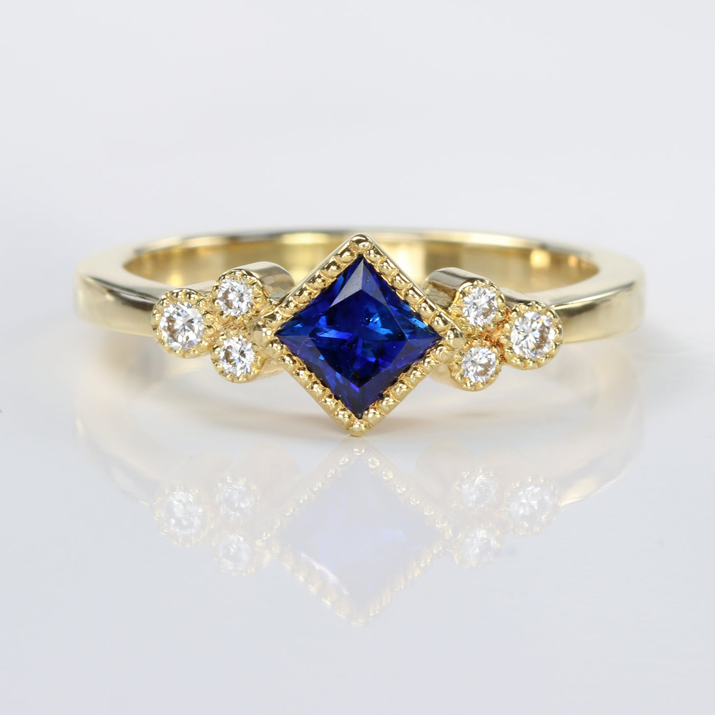 Sennen is a handmade 18ct gold sapphire and diamond ring featuring a vivid blue princess cut sapphire. The 0.66-carat square-cut sapphire is set at an angle for a distinctive look and framed by a cluster of natural Canadian diamonds. Fine milgrain detail surrounds the settings, adding a subtle decorative edge.