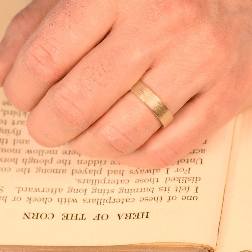 This contemporary wedding ring is made from eco friendly solid 18ct rose gold. The flat (or rectangular) profile 5mm wide band is available in a variety of finishes, including the featured spun silk finish, plus hammered, urban, polished and matte finishes.