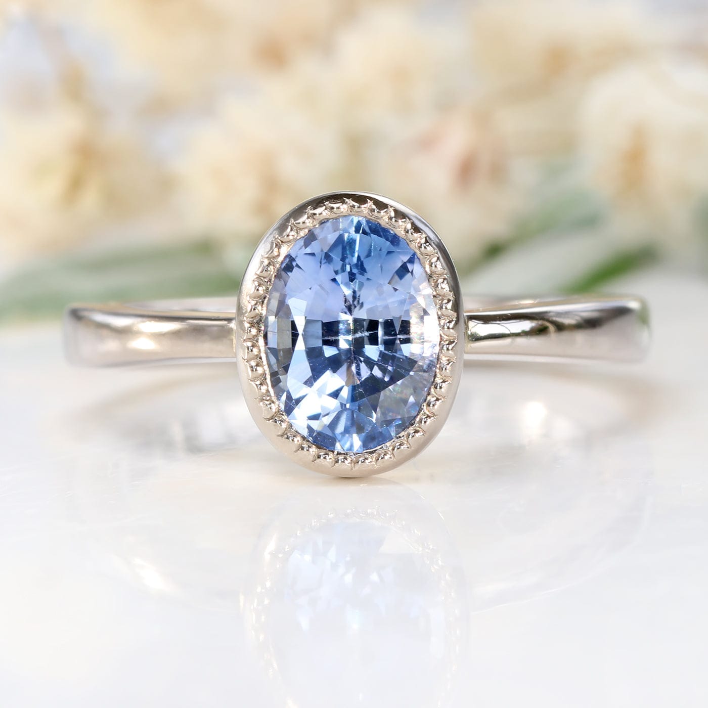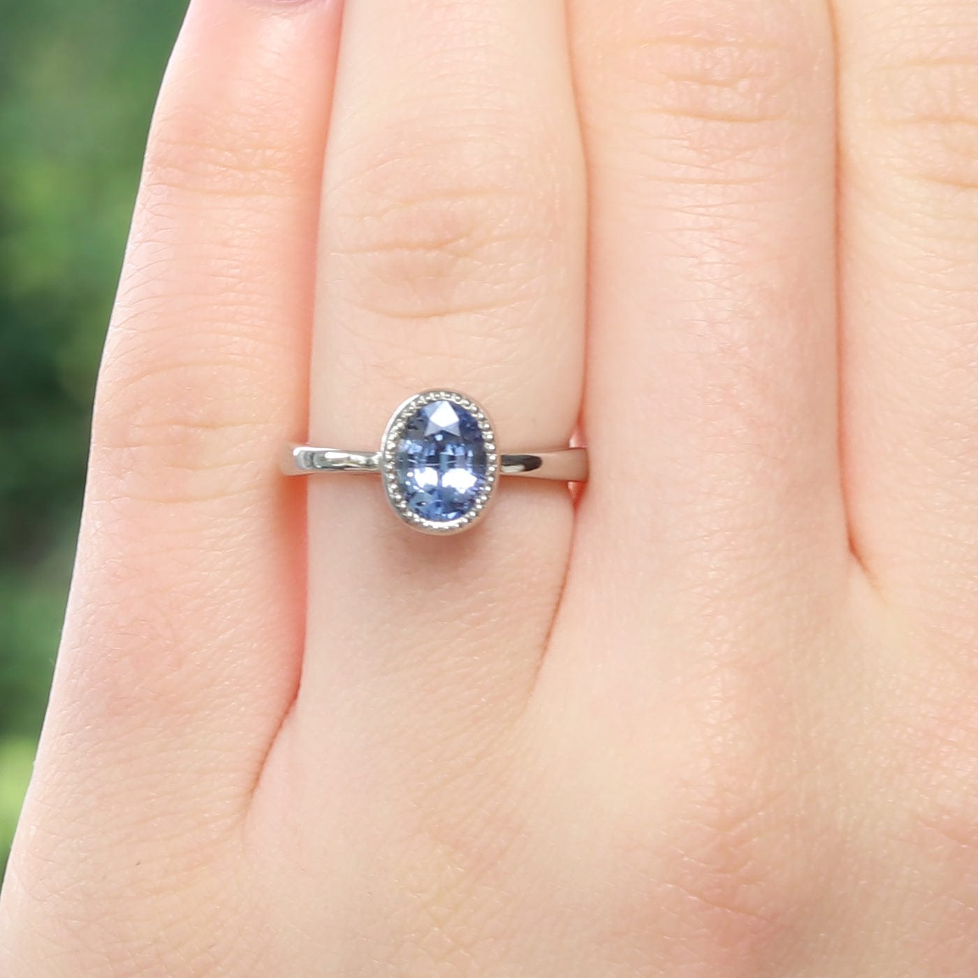 This beautiful blue sapphire ring features a beautiful top grade oval cut blue sapphire, weighing 1.34 carats. The sparkly sapphire is set in a handmade oval bezel setting, with pretty milgrain detail around the stone. The ring is made from ethical solid 18ct palladium white gold. Perfect for an engagement ring or statement ring.