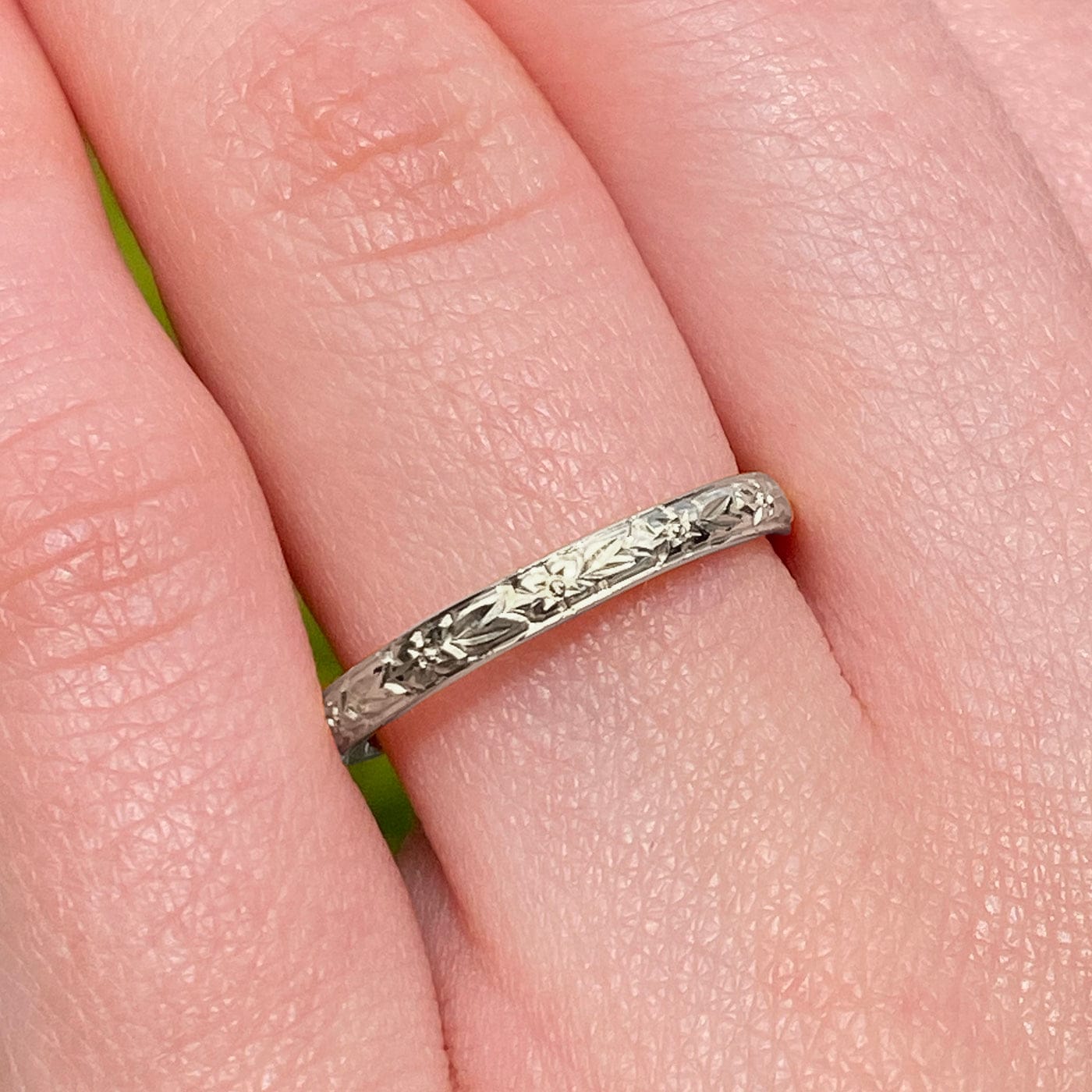 A unique take on the court wedding ring style, handmade with a slim 2.5mm profile in 18ct palladium white gold and detailed with hand engraved orange blossom. A beautifully detailed wedding band available in any UK ring size, including plus sizes and half sizes.