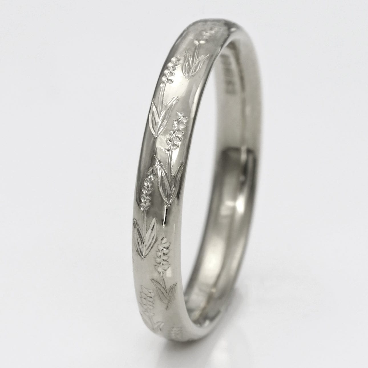A solid 950 platinum 3mm wide court or comfort fit profile wedding band with pretty hand engraved lavender flowers