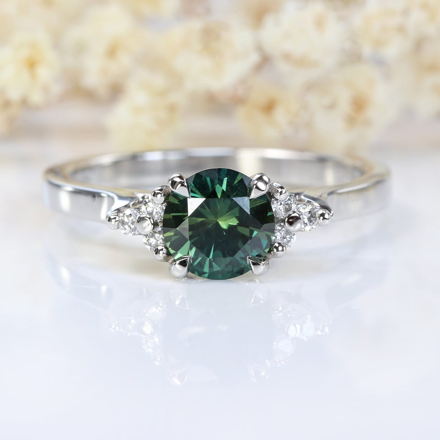 This bespoke solid 950 platinum engagement ring features a brilliant cut Parti sapphire (1.00 carat, 6.14mm), flanked by 6 x 1.5mm fair trade diamonds. The unusual sapphire is mostly green with yellow/blue flashes and was fair trade mined in Central Queensland, Australia.
