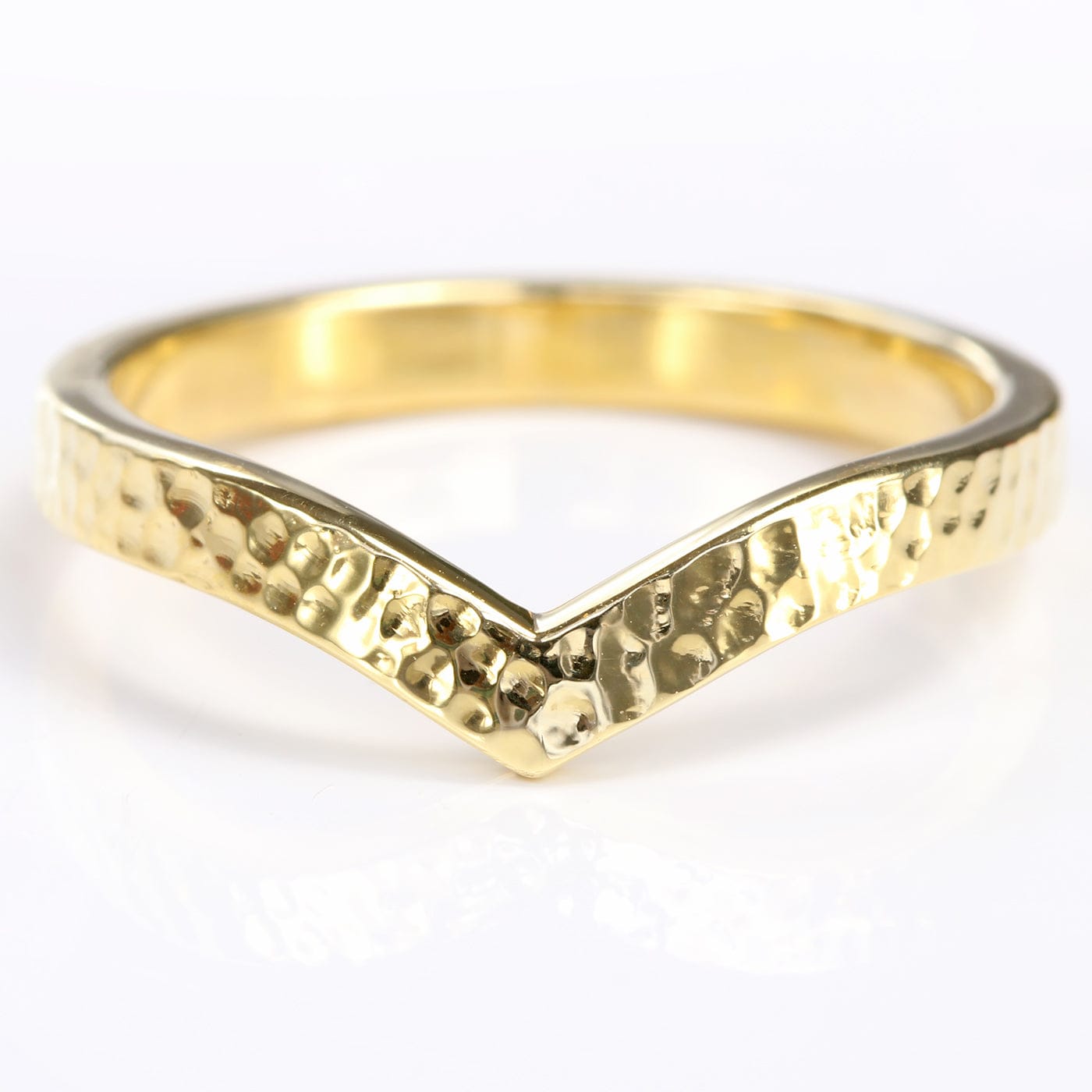 A custom wishbone wedding ring, handmade from solid 18ct gold in a 2.5mm width. The shank has been given a hammered texture and then polished, which bounces the light off each facet.