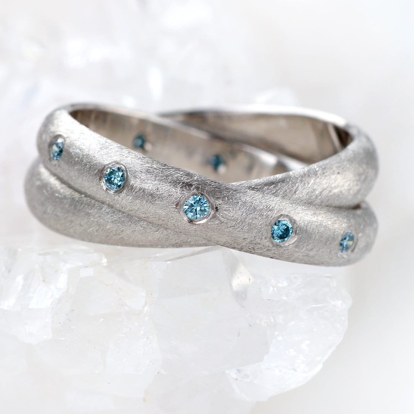 This bespoke 950 platinum rolling ring consists of two 3.5mm wide half round interlocking bands, with one band set with 12 x 1.5mm light blue round diamonds, spaced evenly around the band.