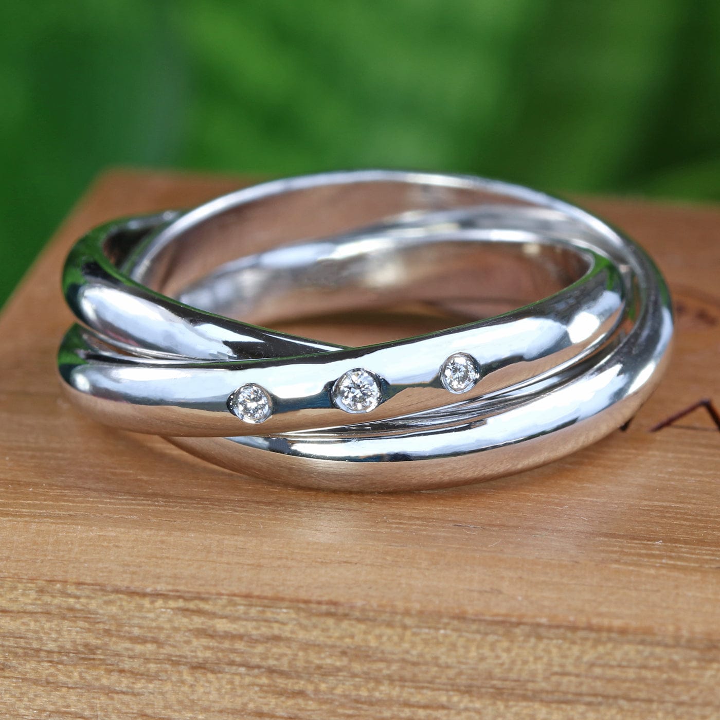 Three 3mm interlocking wedding bands form this classic Russian or Rolling wedding ring. One of the three half round wedding bands is inset with a stunning 1.5mm fair trade diamond, flanked by a 1.3mm diamond on either side. Available to order in the finish of your choice in recycled 18ct gold or platinum.