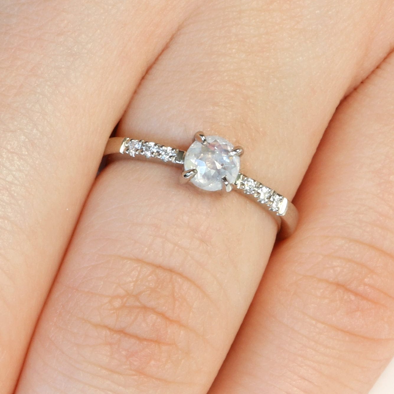 A unique diamond ring, handmade in England using 100% recycled 18ct palladium white gold and set with traceable diamonds. The statement solitaire setting has a claw prong style with a 0.42 carat, 4.9mm icy white diamond from Debswana, Botswana. The slender 2mm band features 6 fair trade Canadian melee diamonds in pavé settings. The statement stone sits raised away from the band, allowing the ring to stack beautifully together with a wedding ring and eternity ring. Gemstone - icy white diamond 0.42 carat, 4.9mm, cut from traceable, conflict free rough, treatment free, mined in Debswana, Botswana; 6 x 1.3mm Canadian fair trade diamonds