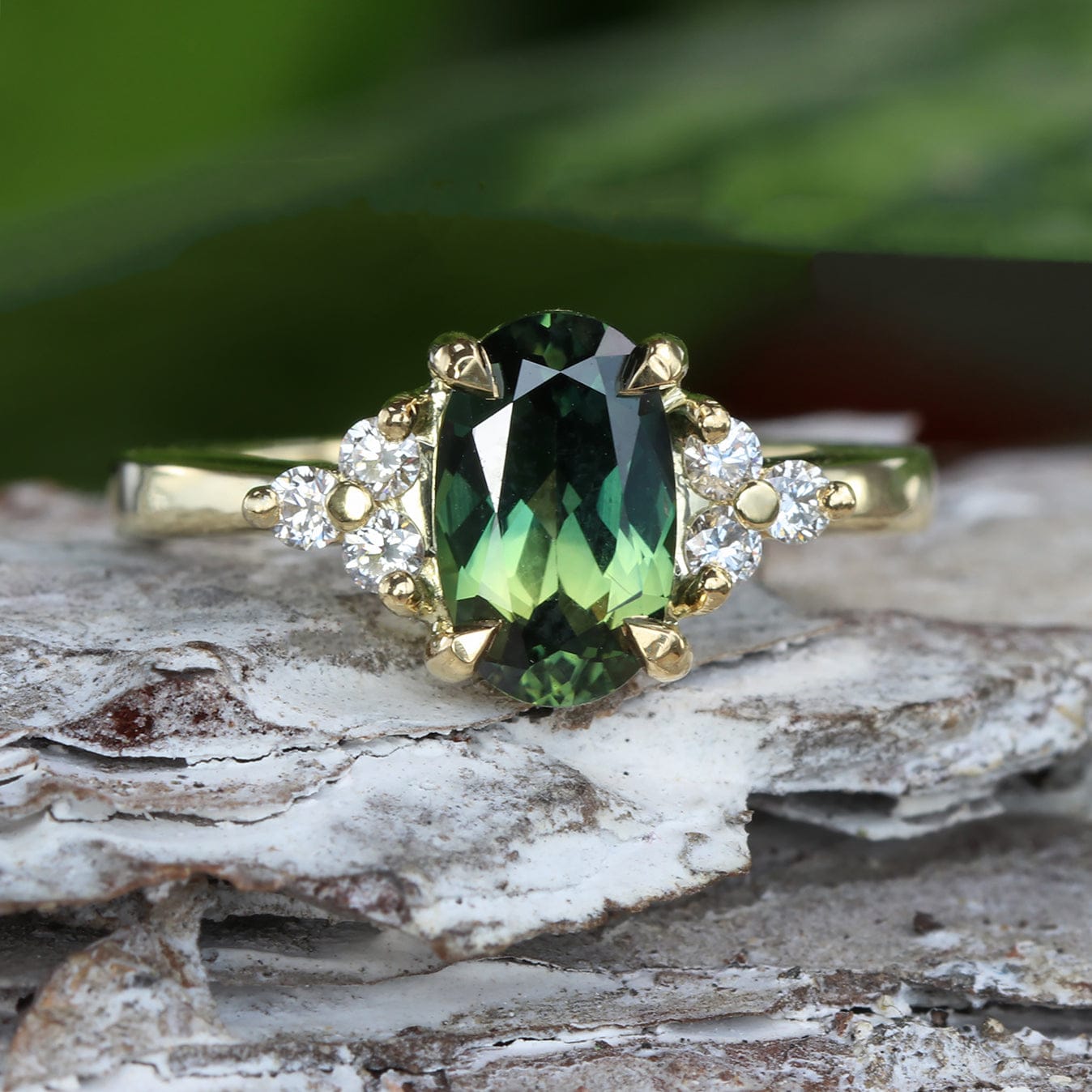 A bespoke 18ct gold sapphire and diamond cluster engagement ring. The ring is set with an oval Parti sapphire, fair trade mined in Queensland. This natural, 1.28 carat (8.43mm x 5.19mm) gemstone has an unusual mix of colours, with blue at one end and yellow at the other, creating the illusion that the stone is green! A cluster of 6 x 1.7mm Canadian diamonds hug each side of the main setting.