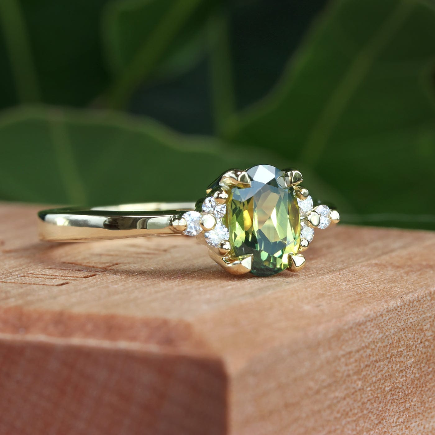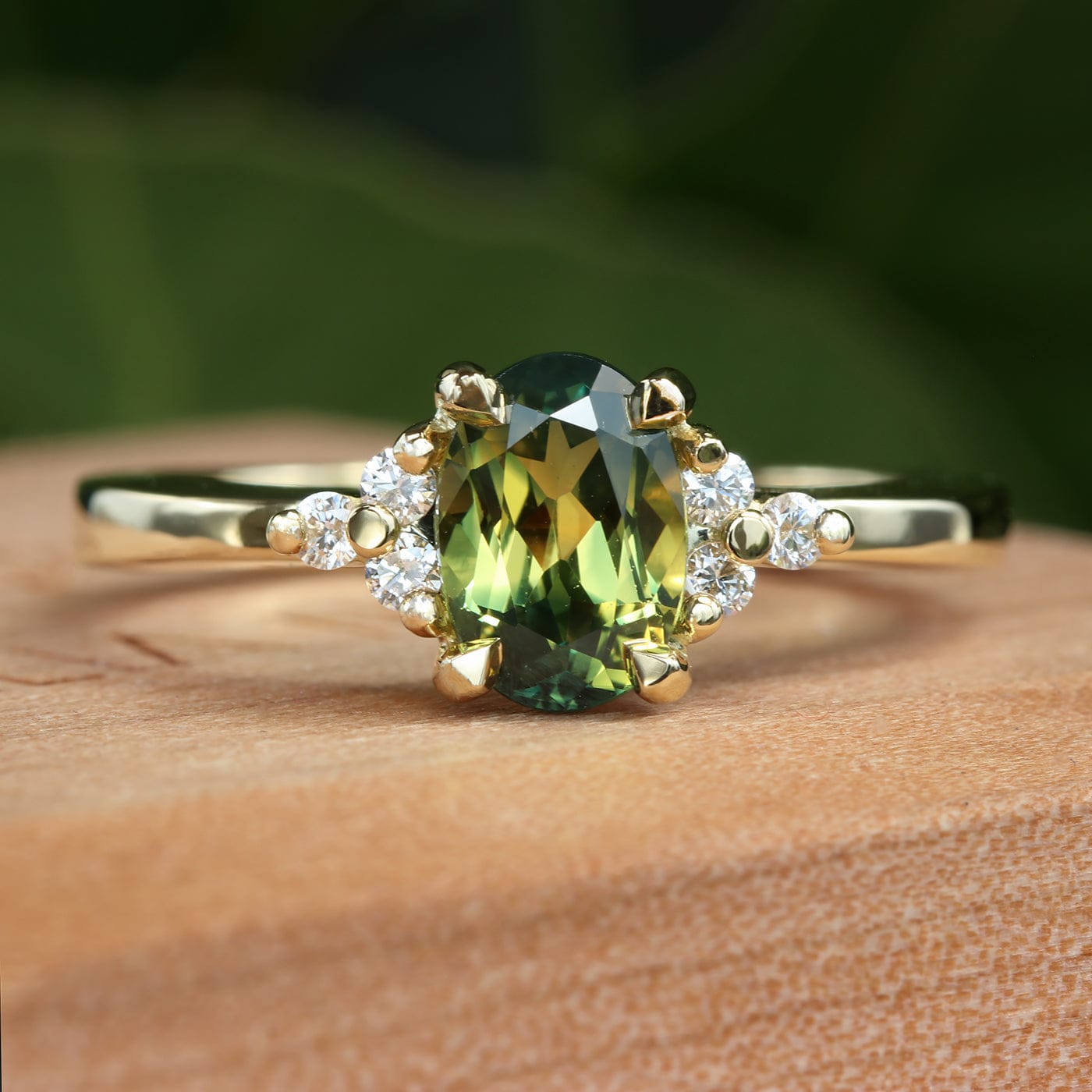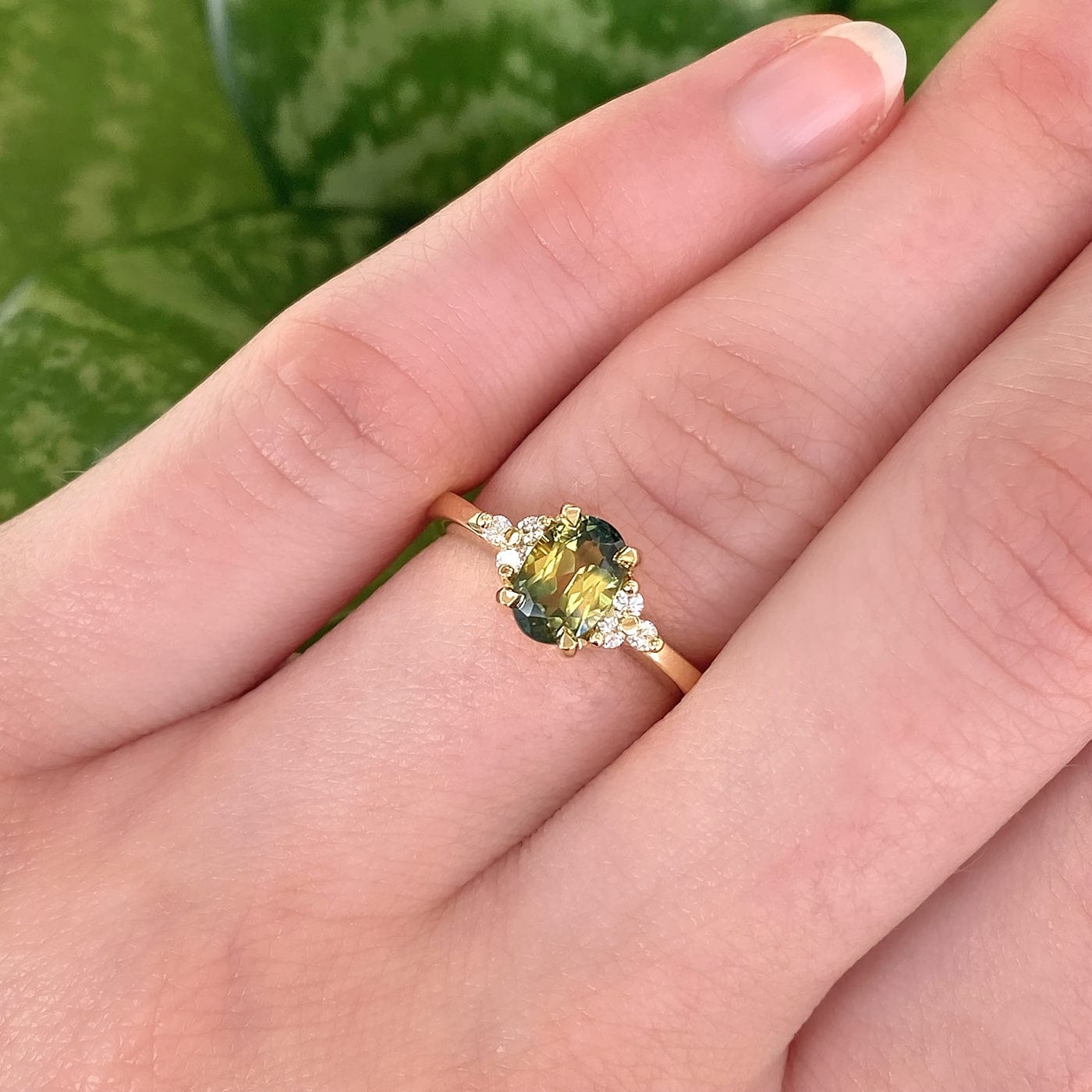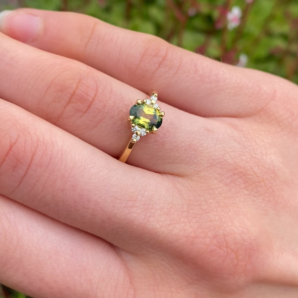 A beautiful bespoke solid 18ct gold engagement ring set with an oval Parti sapphire. The completely natural and unheated stone weighs 1.07 carats (measurements 7.07mm x 4.94mm). This unusual Australian (Central Queensland) sapphire has a yellow centre and very dark green ends. A cluster of fair trade Canadian white diamonds hug each side of the main setting.