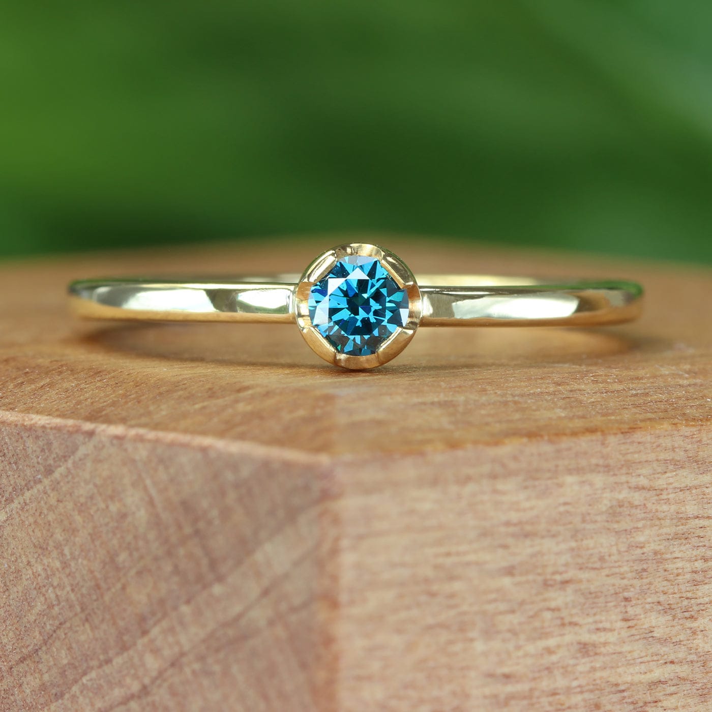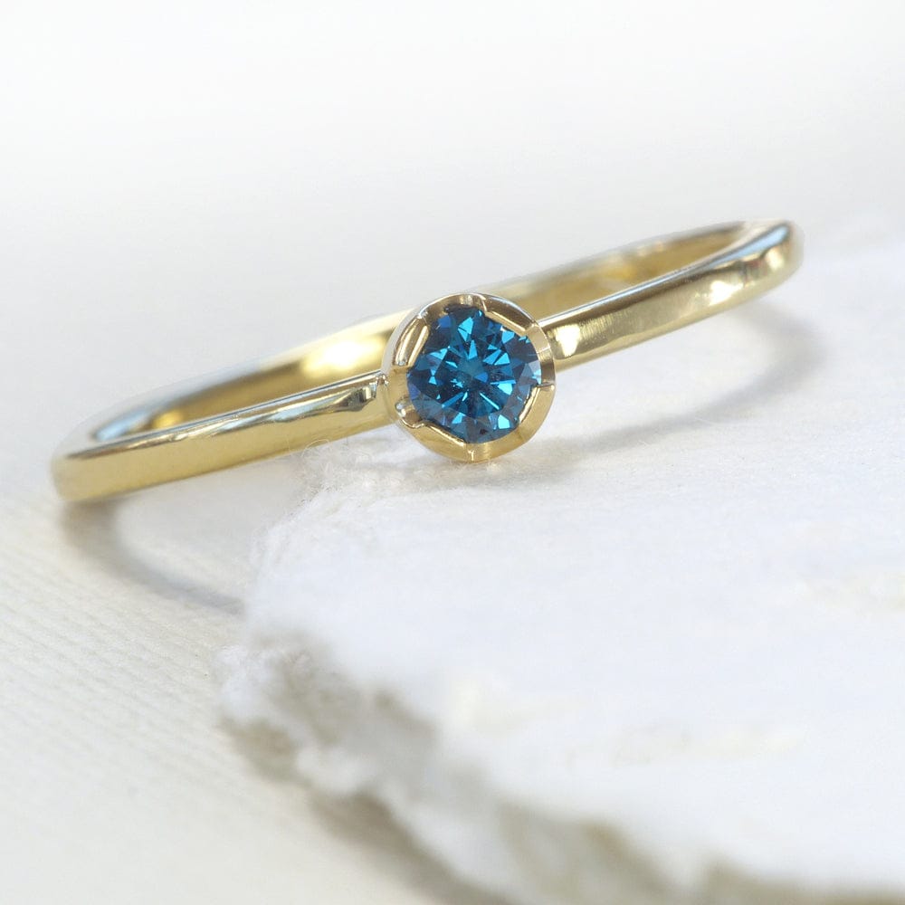 Discover the elegance of this dainty blue diamond solitaire ring, meticulously handcrafted from solid 18ct gold. It's a charming choice, perfect for an engagement or as an addition to your stackable ring collection. The radiant 3.2mm blue diamond is delicately cradled in Lilia's signature bud setting, gracefully perched atop a 1.3mm wide band with a contemporary square profile, crafted in solid 18ct gold.