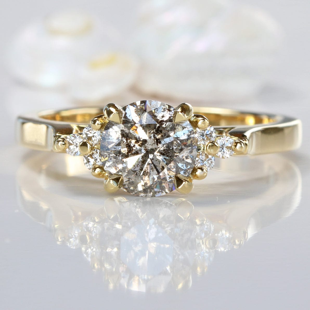 This handmade 18ct gold cluster engagement ring is set with a 1.09 carat salt and pepper diamond measuring 6.5 mm. The diamond is completely natural, with a cut that reflects the light beautifully and gives the gem a soft, vintage mirror-like appearance.