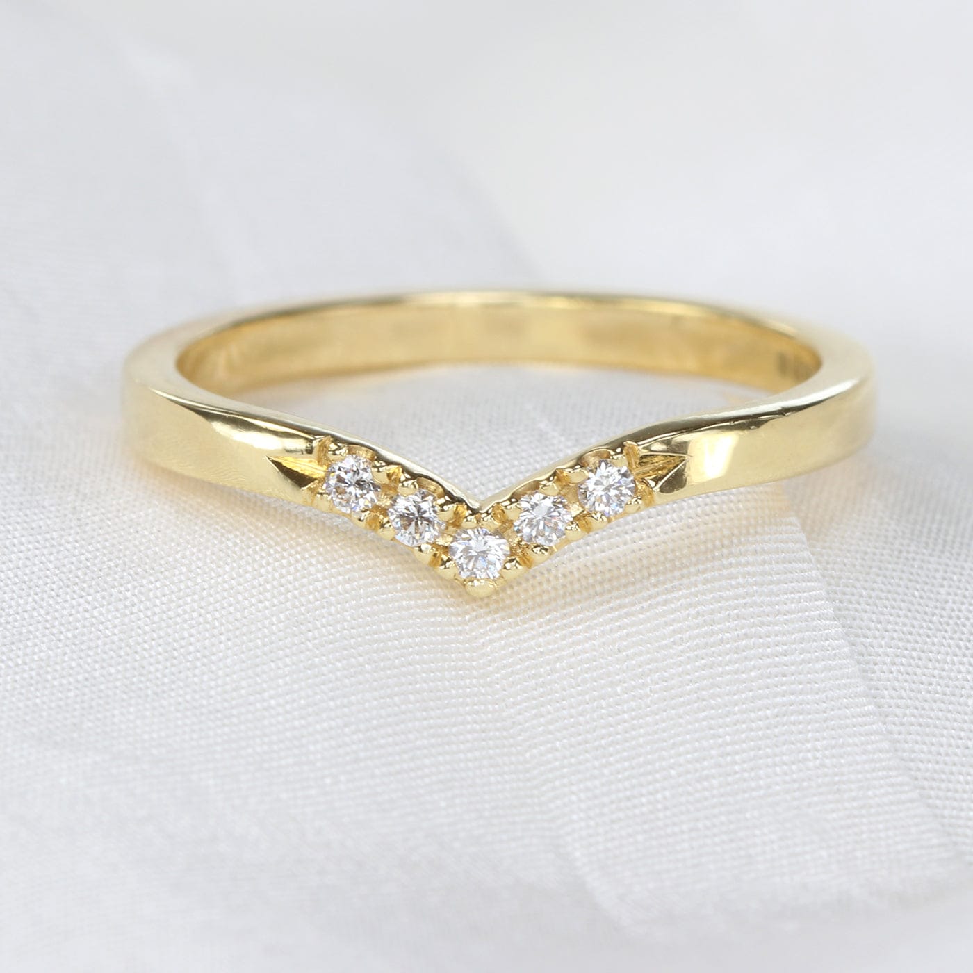 A pretty 18ct gold wishbone ring, pavé set with five Canadian fair trade diamonds. This ring is suitable for wear as either a wedding ring or eternity ring, or wear several together to create a unique ring stack.
