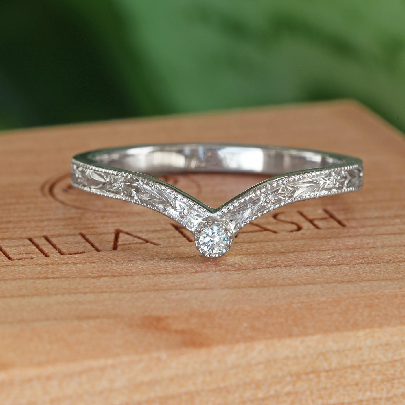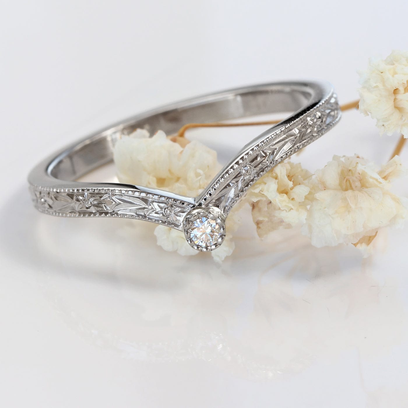 A beautiful diamond solitaire wishbone wedding or eternity ring, with a floral orange blossom hand engraving around the band.