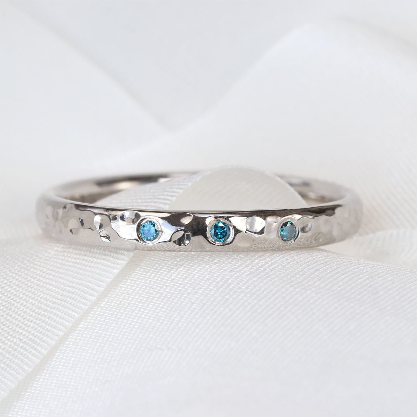 An unusual solid 950 platinum wedding ring set with a trio of petite blue diamonds in a hand finished hammered band (2.5mm wide).