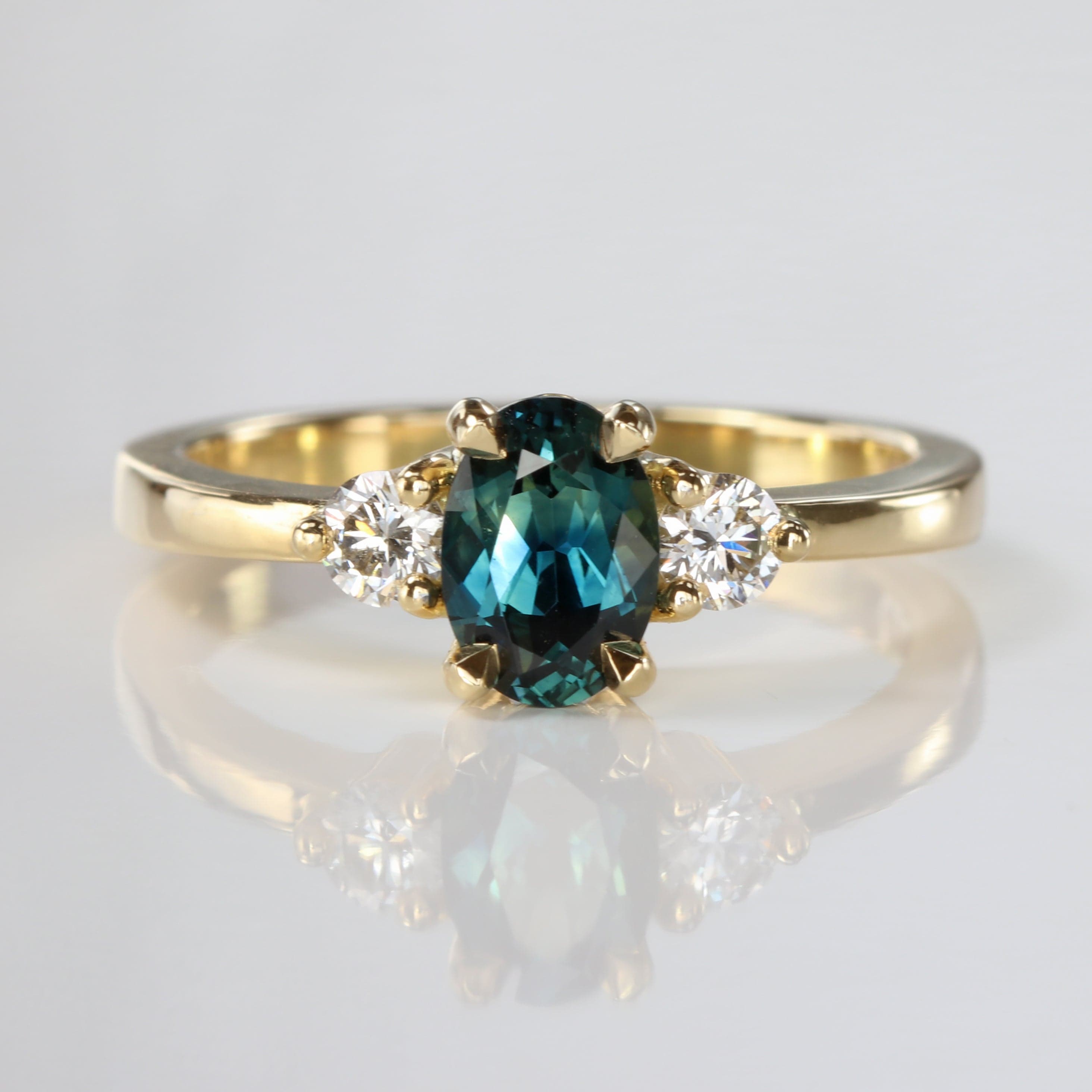 This handmade 18ct gold trilogy engagement ring is set with a natural fair trade Parti sapphire showing a mix of blue, green and yellow tones created entirely by nature. The gem measures 6.78 × 4.78 mm, weighs 0.90 carats, and its colours shift toward rich teal as the light moves across the surface.