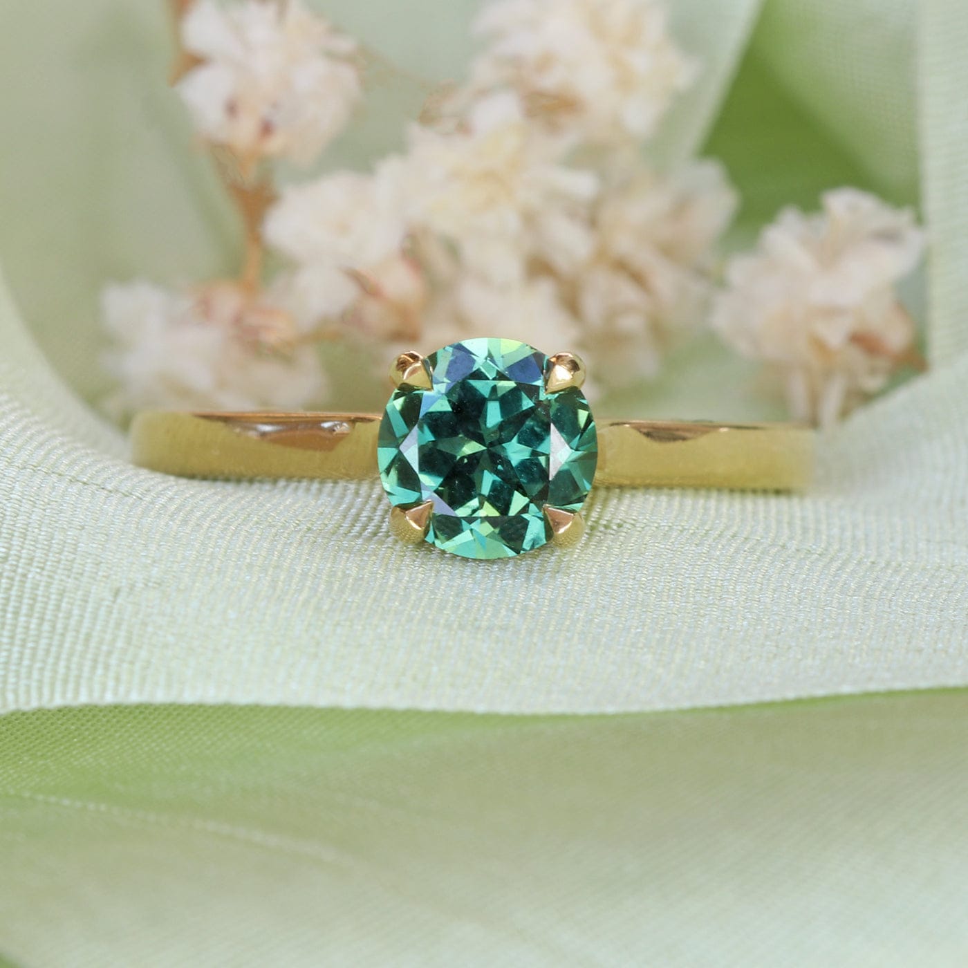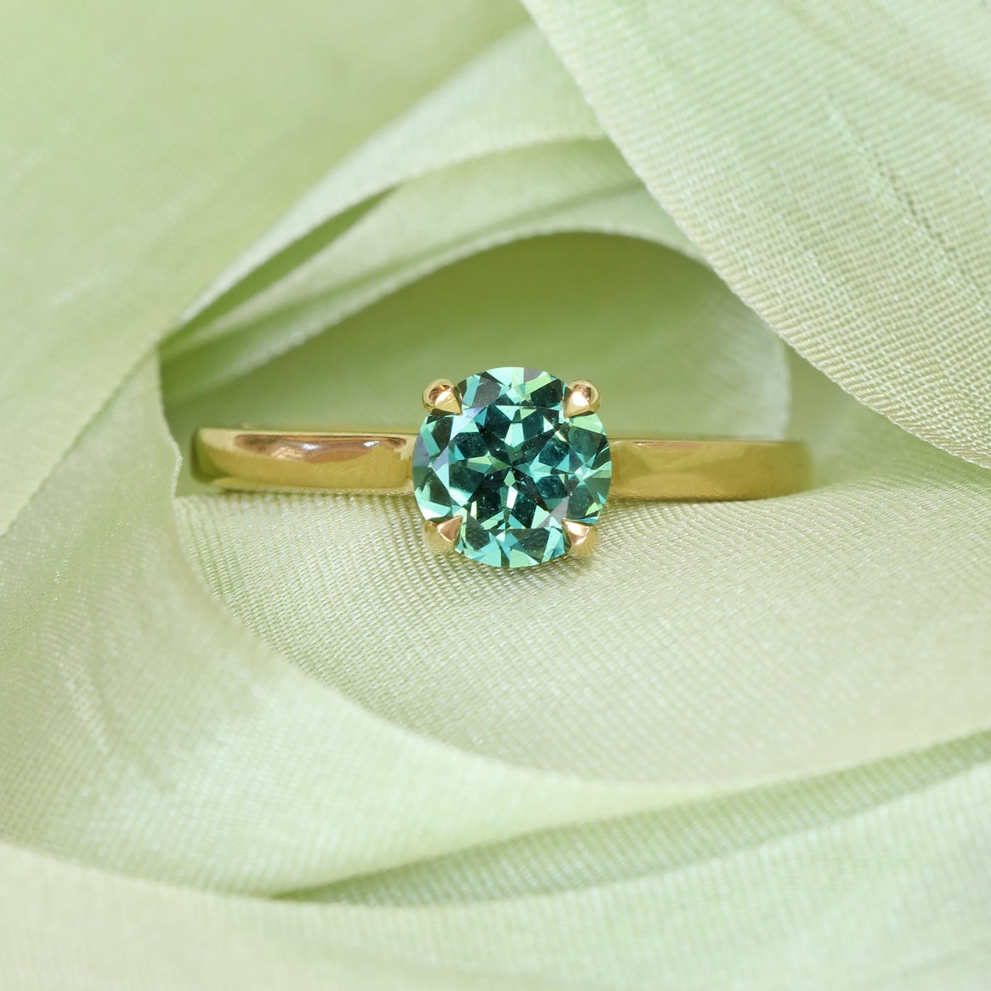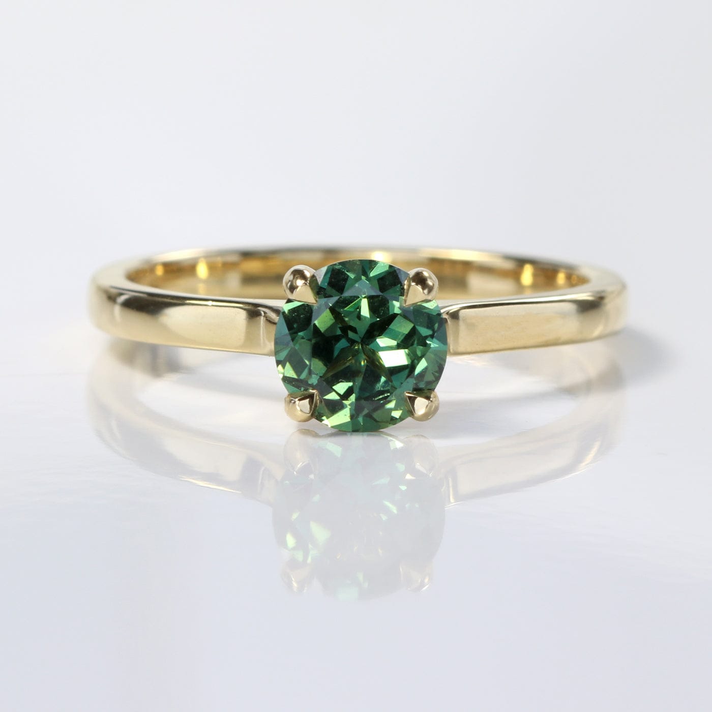 This handmade 18ct gold solitaire engagement ring features a fair trade Australian Parti sapphire weighing 0.87 carats and measuring 5.85 mm. The sapphire shows a natural mix of teal and green tones that shift as the light moves across the facets.
