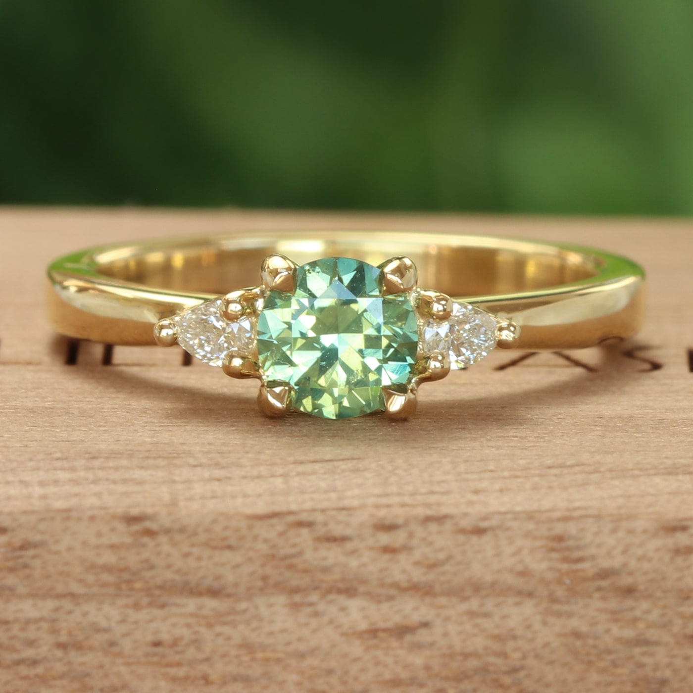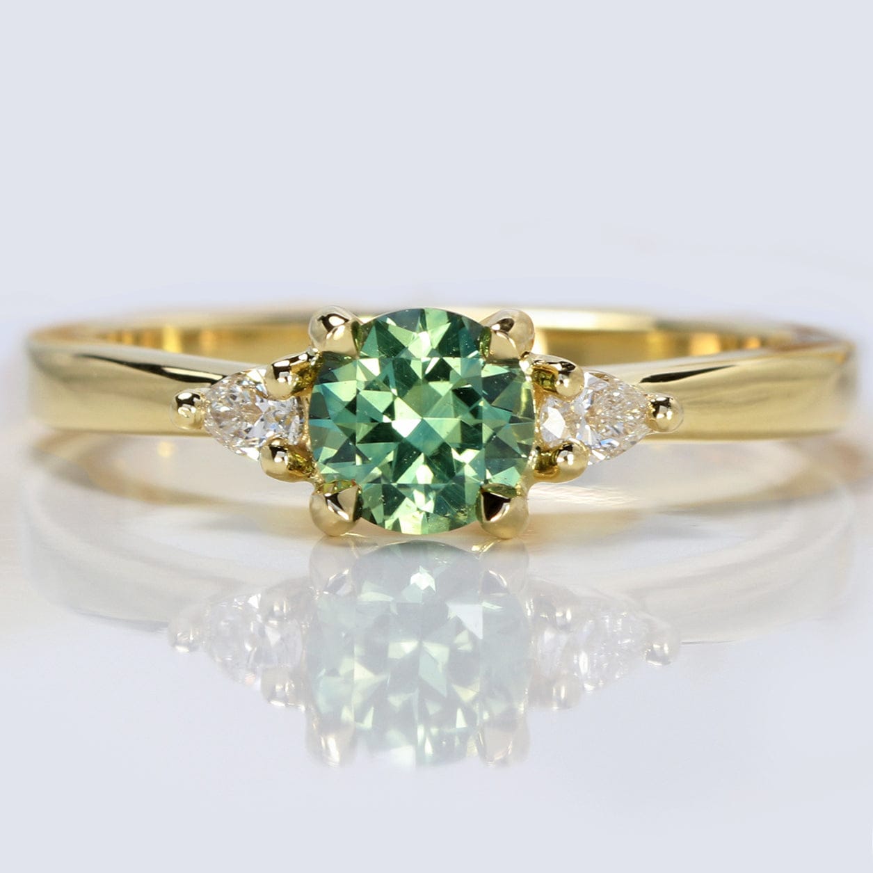 This beautiful trilogy engagement ring is set with an alluring green sapphire, fair trade mined in Queensland, Australia. The 5mm sapphire weighs 0.6 carats. Hugging the centre sapphire are two pear cut natural diamonds measuring 3mm × 2mm (graded G colour and SI1 clarity), with a combined weight of 0.10 carats.