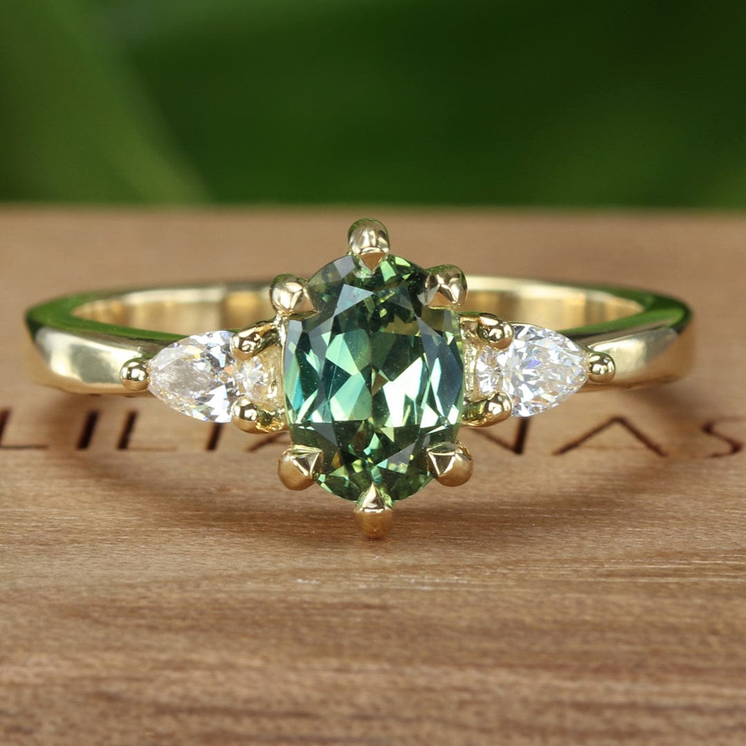 Veryan: Handmade 18ct Gold Fair Trade Oval Green Sapphire & Diamond Trilogy Engagement Ring