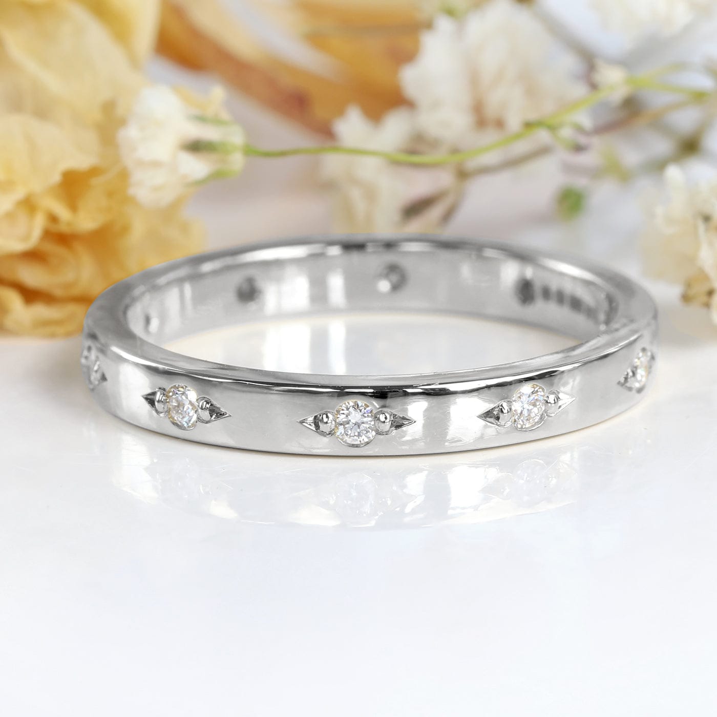 Dazzle in our handmade 950 platinum diamond eternity ring, crafted in England from recycled platinum. Its sleek 2.5mm x 1.5mm flat profile showcases ten 1.5mm fair trade diamonds, spaced with precision around the band. With a mirror-like polish, this ring gleams with every turn.