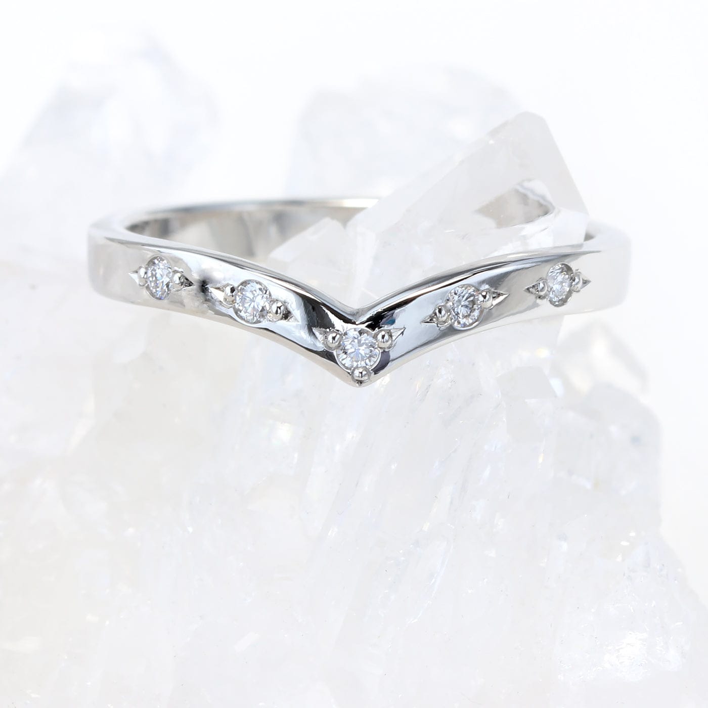 Discover the elegance of our palladium white gold wishbone eternity ring, featuring five fair trade diamonds set along the front curve of the band.