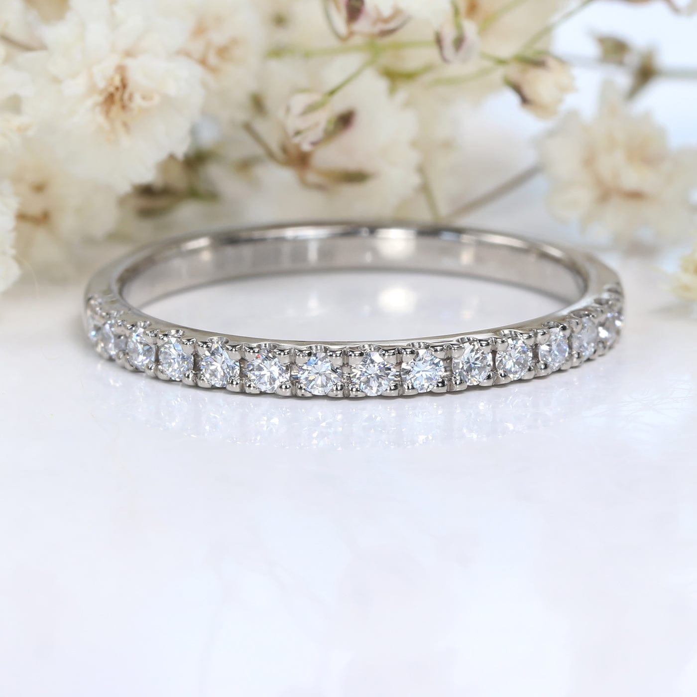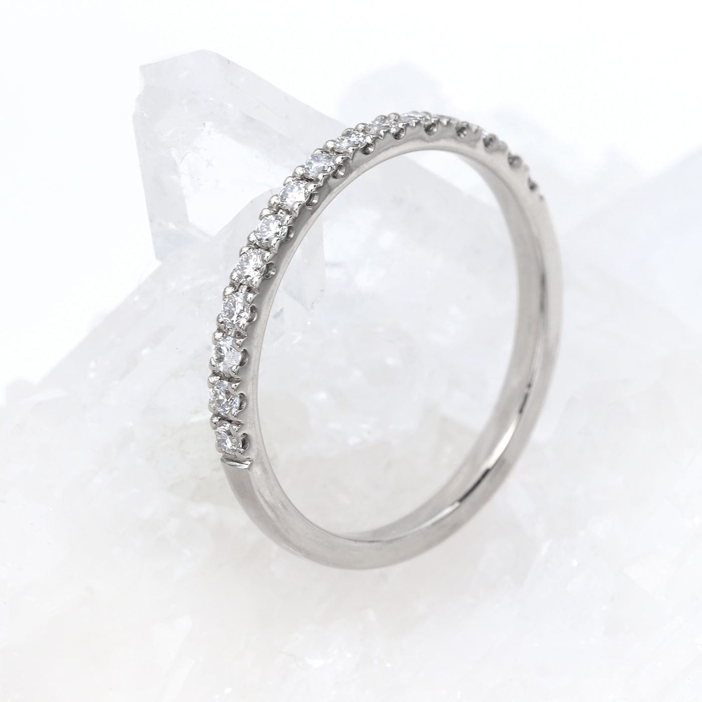 An ethically made diamond ring created using recycled solid 950 platinum, set with 15 fair trade white diamonds. Created with a slim 1.8mm width, this polished wedding band features fifteen 1.5mm fair trade Canadian diamonds, pavé set at the front of the band.