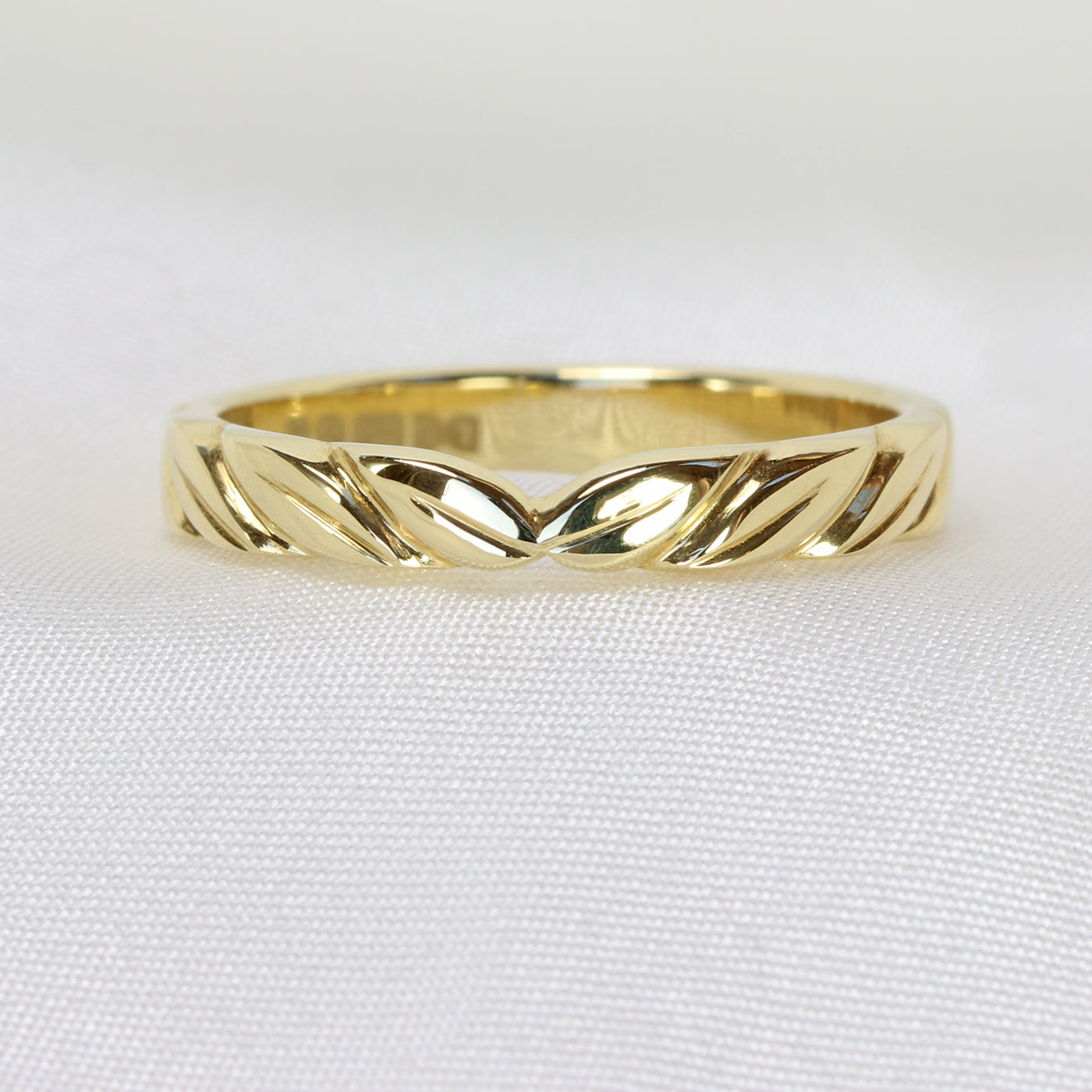 Crafted in our Cornwall Studio using sustainable recycled 18ct gold, this distinct 3mm x 1.5mm wedding band showcases delicate hand-carved leaves.