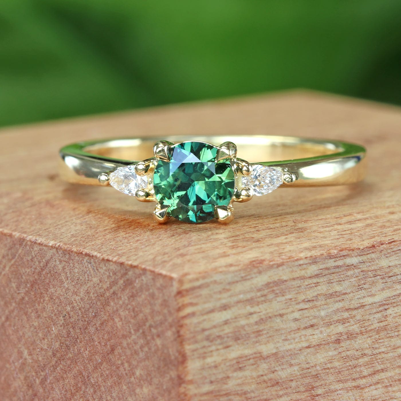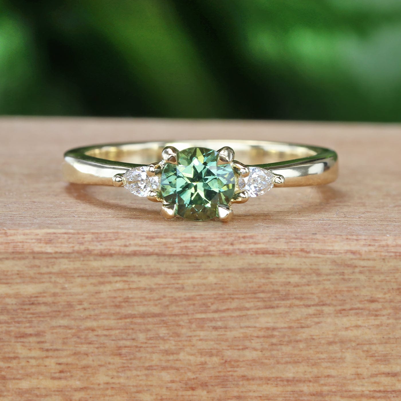 Custom trilogy engagement ring set with a green sapphire, fair trade mined in Queensland, Australia. The 5mm sapphire weighs 0.6 carats. Hugging the centre sapphire are two pear cut diamonds measuring 3mm × 2mm (graded G colour and SI1 clarity), with a combined weight of 0.10 carats.