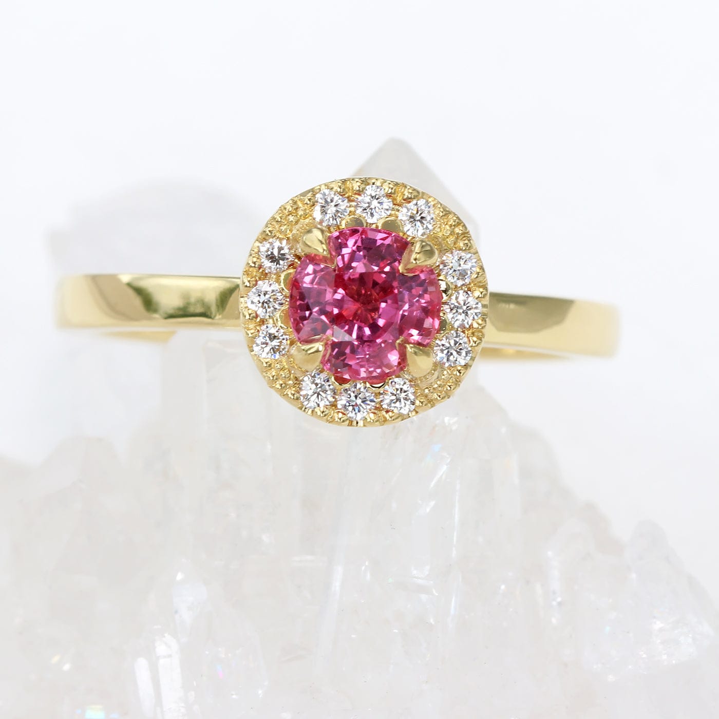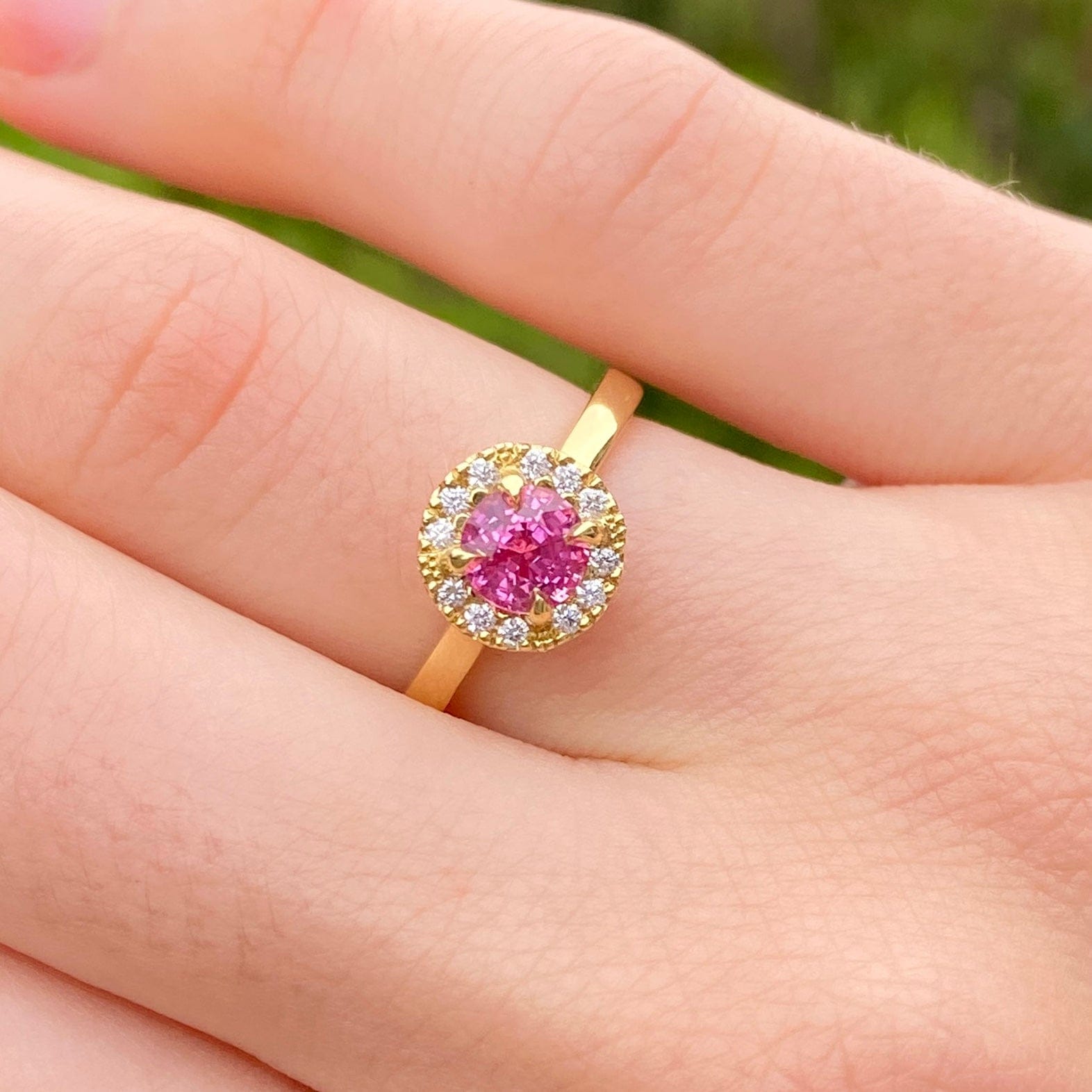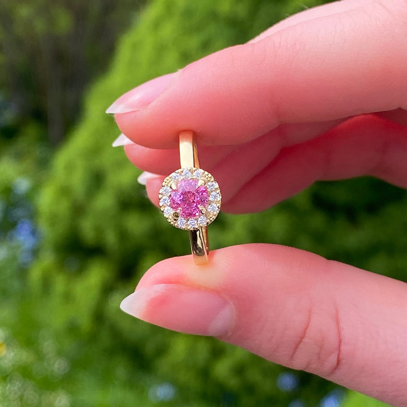 Custom 18ct Gold Pink Sapphire & Diamond Halo Engagement Ring