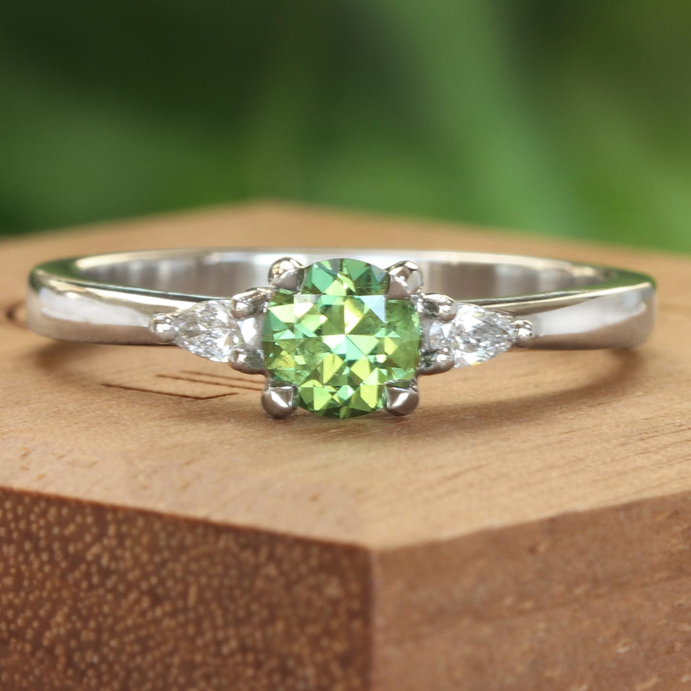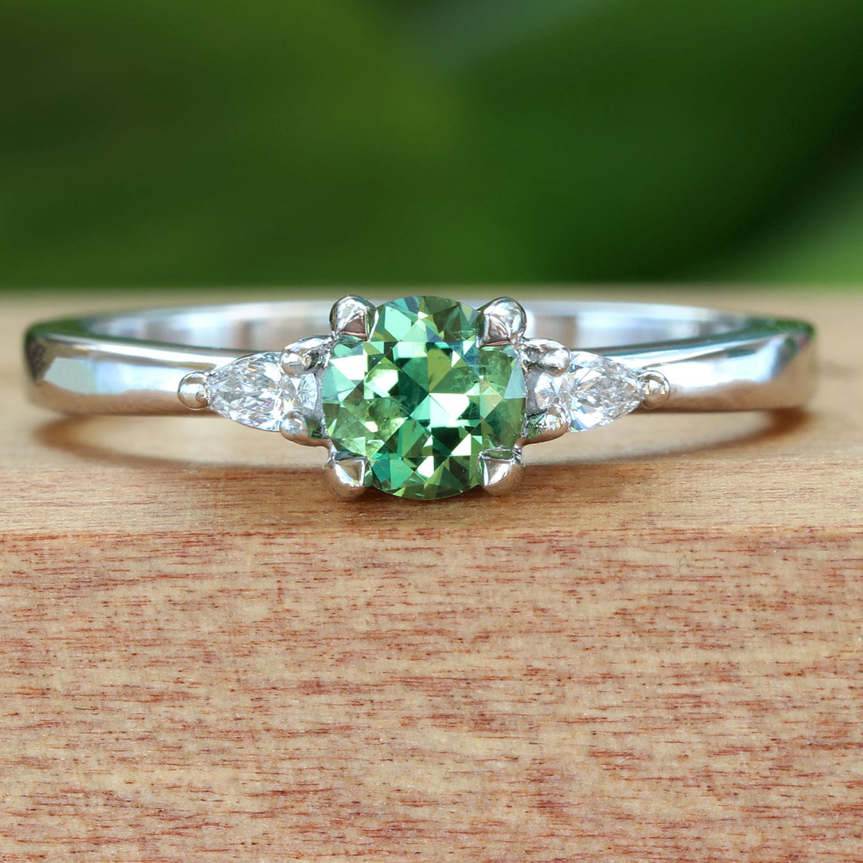 Pentillie: Handmade 950 Platinum Fair Trade Green Sapphire and Diamond Trilogy Engagement Ring