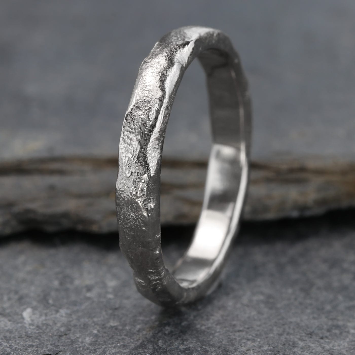 Introducing Mineral: our unique range of free-form wedding rings. With an organic aesthetic reminiscent of molten volcanic formations, this 3mm band, fashioned from solid 950 platinum, is the perfect symbol for brides or grooms desiring a touch distinct from the norm.