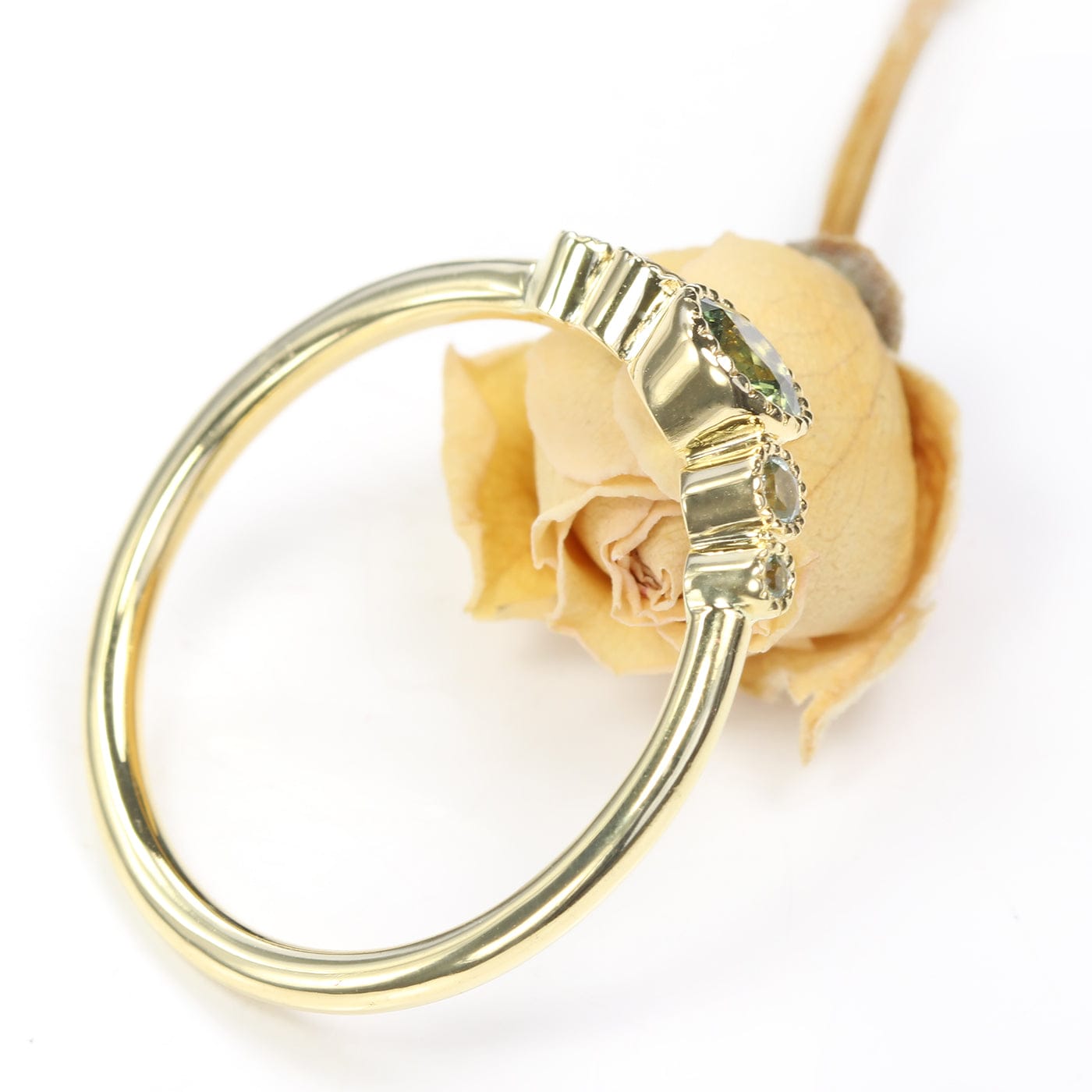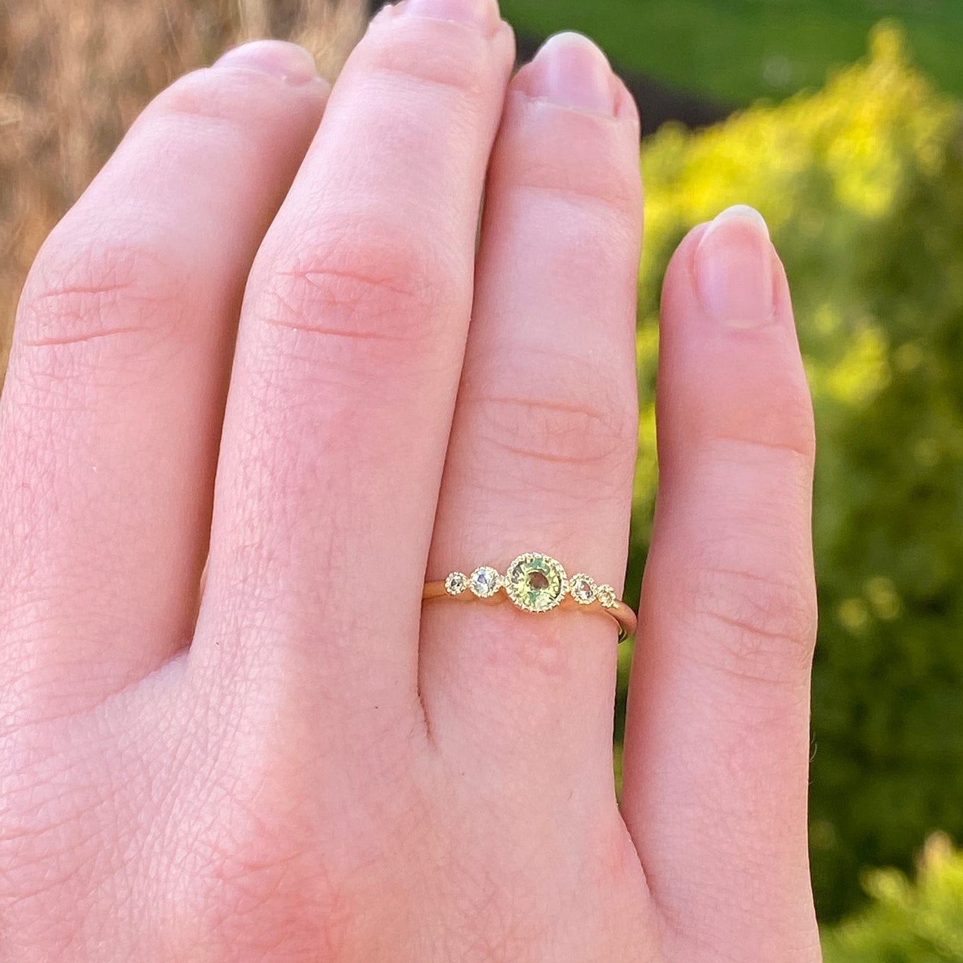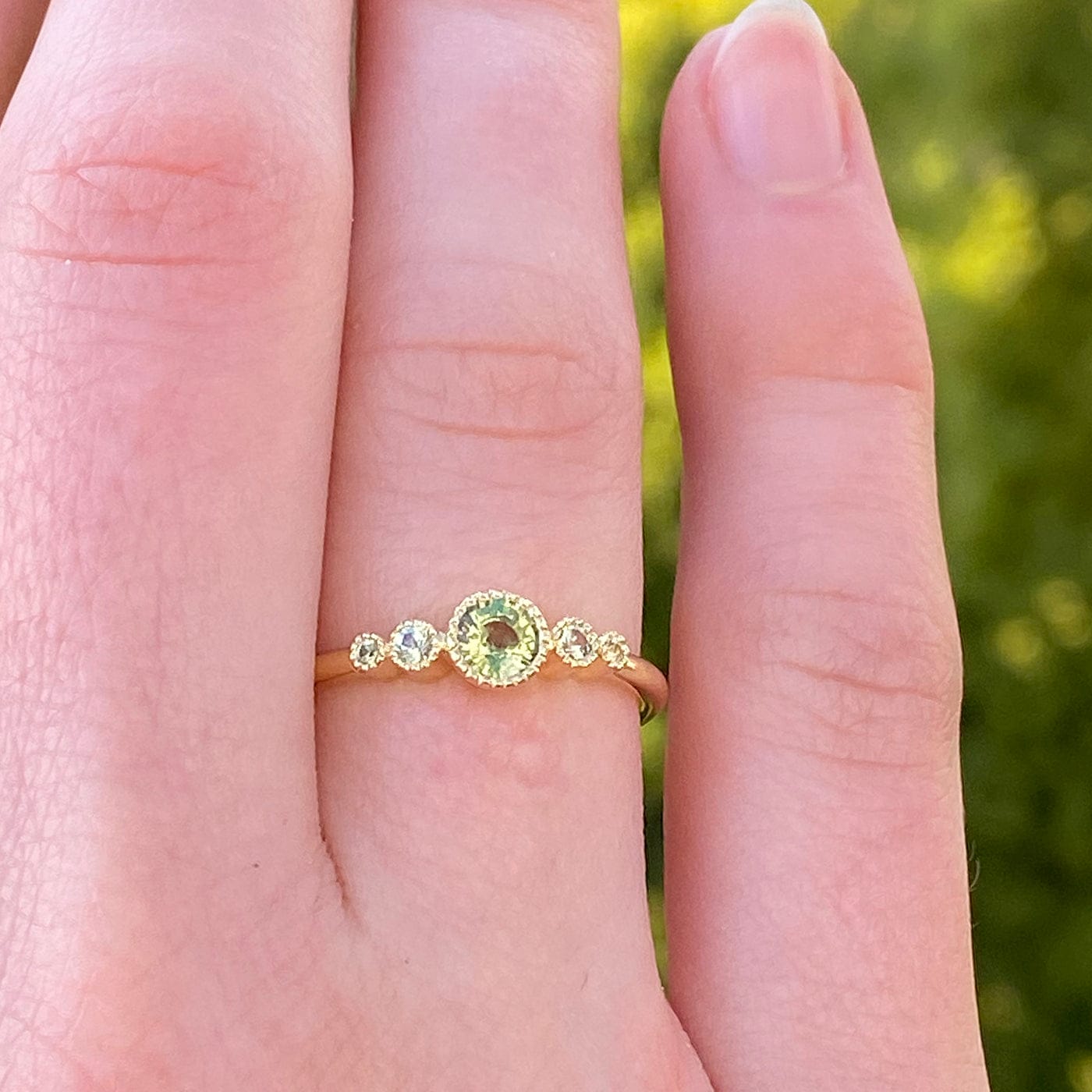 Dive into the allure of this 5-stone engagement ring, centered around a vibrant 4mm apple green sapphire, nestled between four lighter-hued sapphires. Painstakingly crafted from recycled 18ct gold, its delicate 1.5mm halo band houses each gem in an intricate bezel setting, adorned with timeless milgrain engravings. Gemstones: Central 4mm green sapphire, flanked by 2 x 2mm & 2 x 1.3mm pale green sapphires