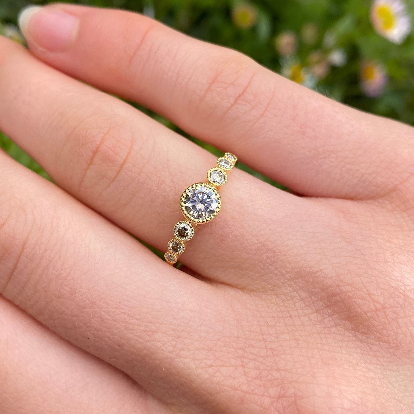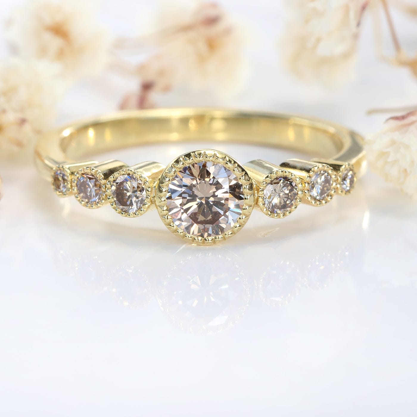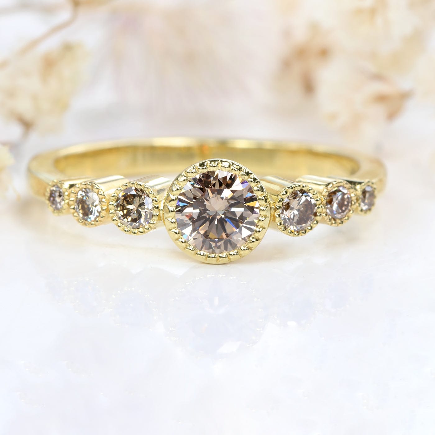 This exquisite ring features seven radiant Champagne diamonds, seamlessly graduating in size from 1.5mm to 4.6mm. These ethically sourced gems gleam brilliantly, boasting a deep champagne hue, complemented by delicate milgrain details surrounding them. Each diamond was meticulously selected to ensure a harmonious shade match.