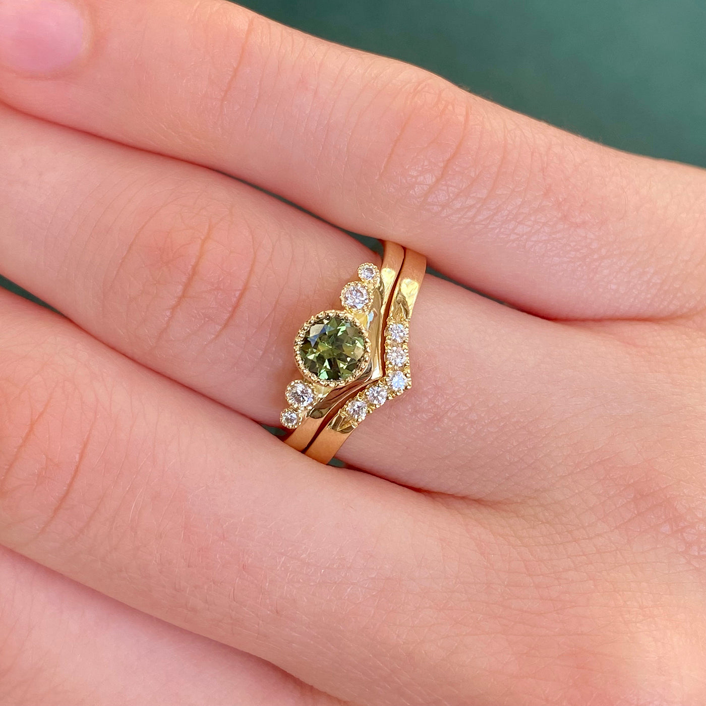 The sapphire is framed by four fair trade natural Canadian diamonds. Two measure 2 mm and two measure 1.3 mm, arranged along the curve of the band to highlight the central gem without overpowering it. This style also pairs seamlessly with Lilia’s shaped-to-fit wishbone wedding rings.