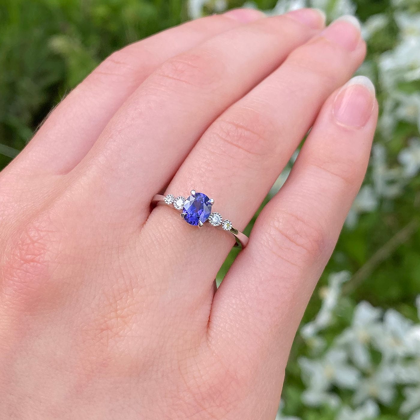 A custom made ring wet with a dazzling purple-blue Ceylon sapphire, with pink flashes. The oval cut sapphire measures 5.9mm x 4.9mm and weighs 0.7 carat and is hugged by four fair trade Canadian diamonds in pretty milgrain-edged settings. This ring was handmade by Lilia in our Cornish studio from 100% recycled solid 950 platinum.