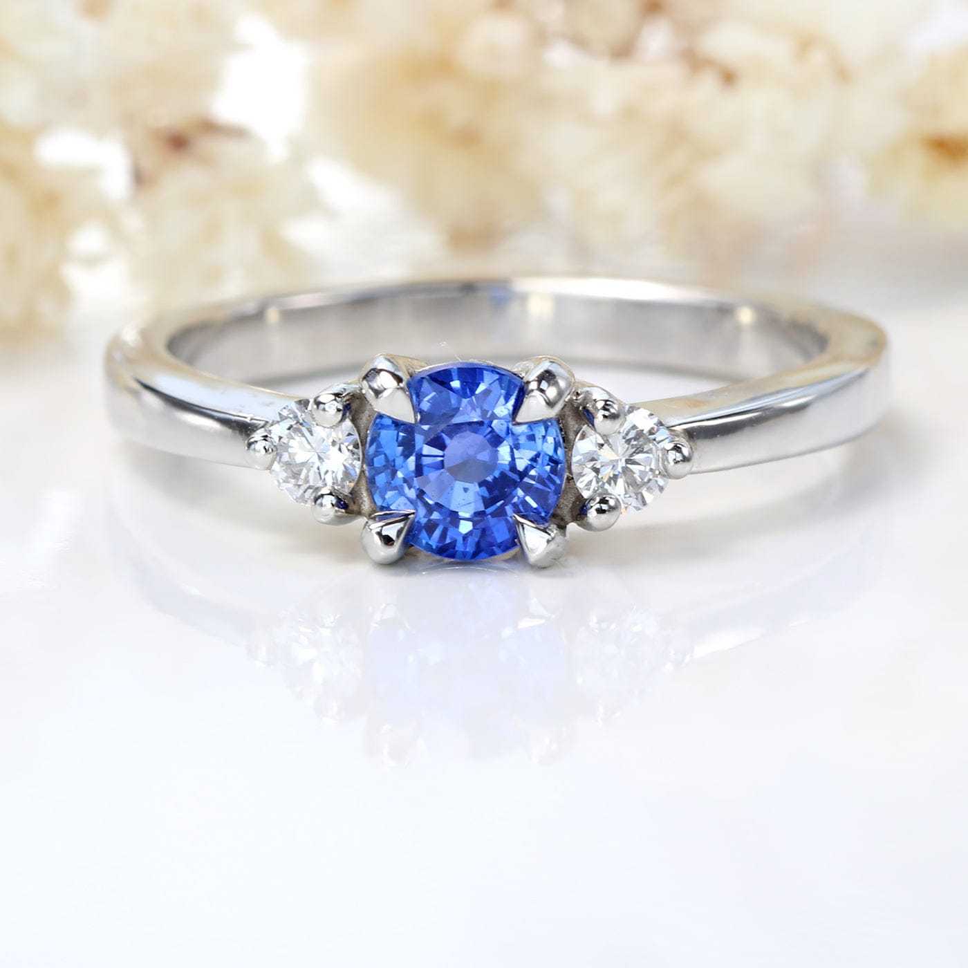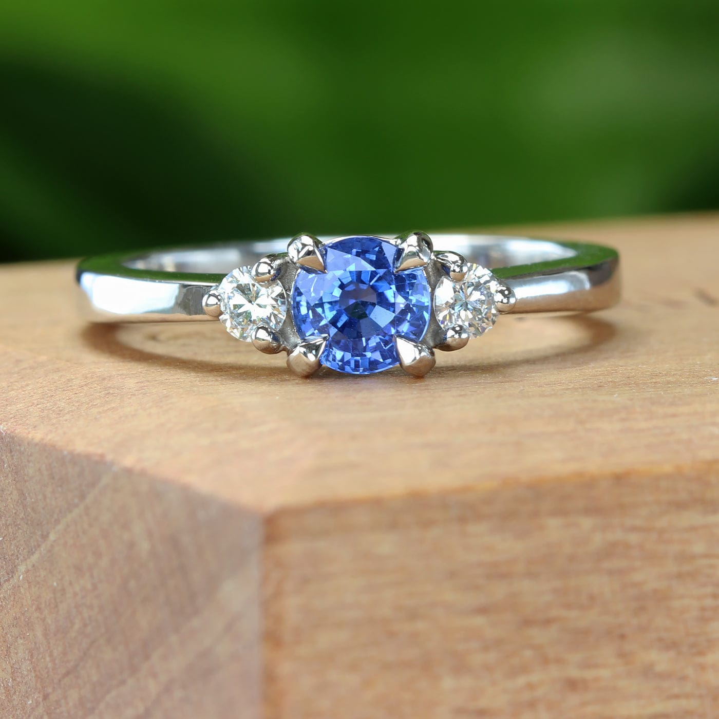 A beautiful Ceylon sapphire and diamond trilogy ring, handmade from solid 950 platinum (can be make in 18ct gold). The beautiful Cornflower Blue colour sapphire (4.6mm 0.52 carat) is flanked by two 2.5mm (0.12 ct) Canadian white diamonds, all set in prong settings. The band is 2mm wide, narrowing at the front.