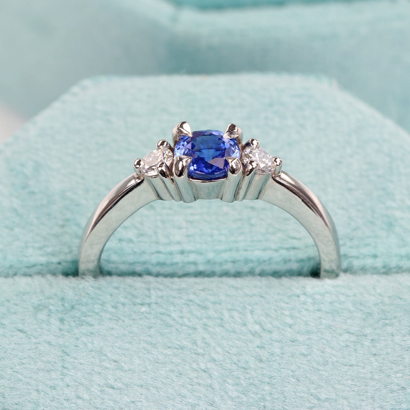 Custom Ceylon Sapphire and Diamond Trilogy Platinum Engagement Ring