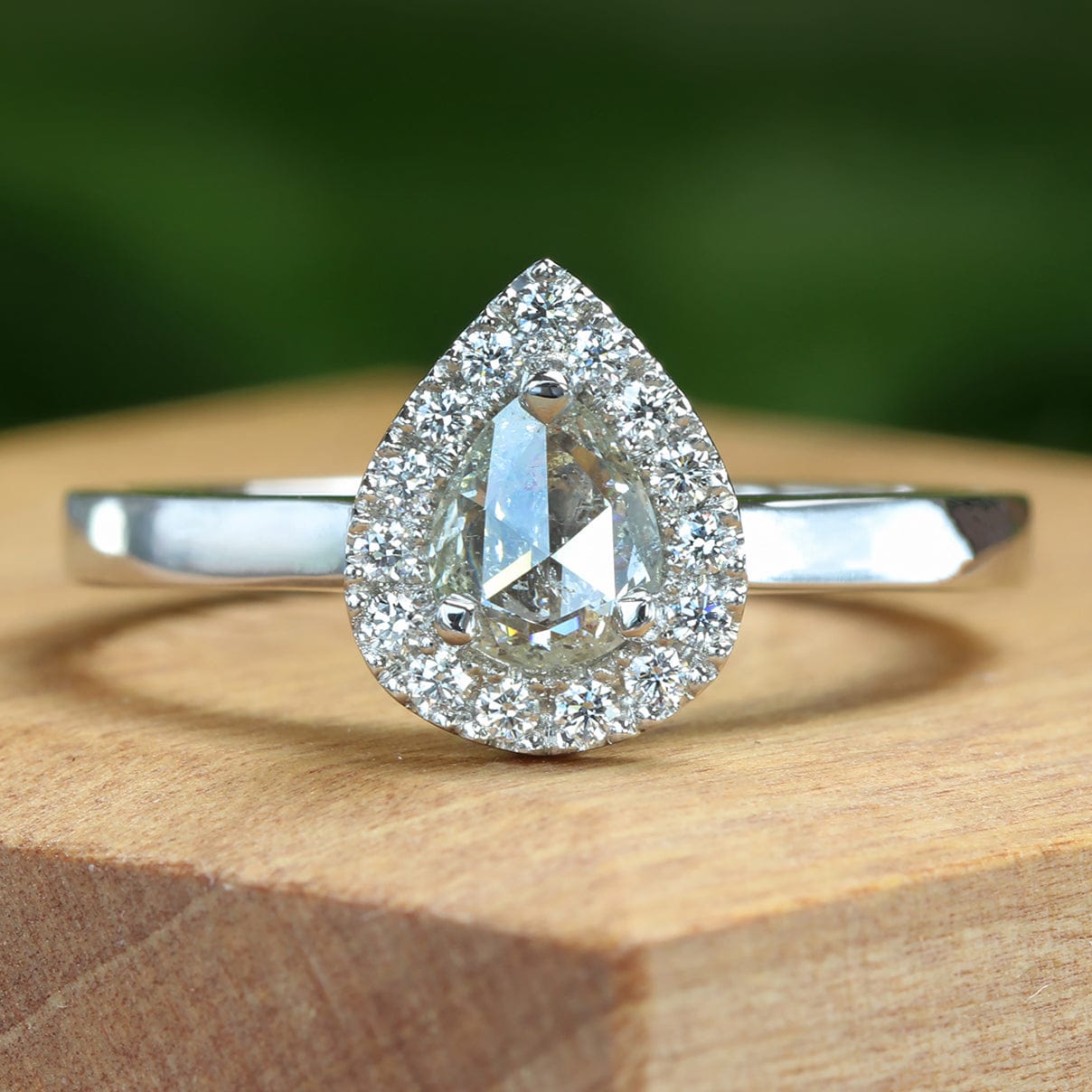 Surrounding the centre stone are fifteen brilliant cut Canadian fair trade diamonds, arranged in a soft teardrop halo that enhances the shape and character of the rose cut diamond.