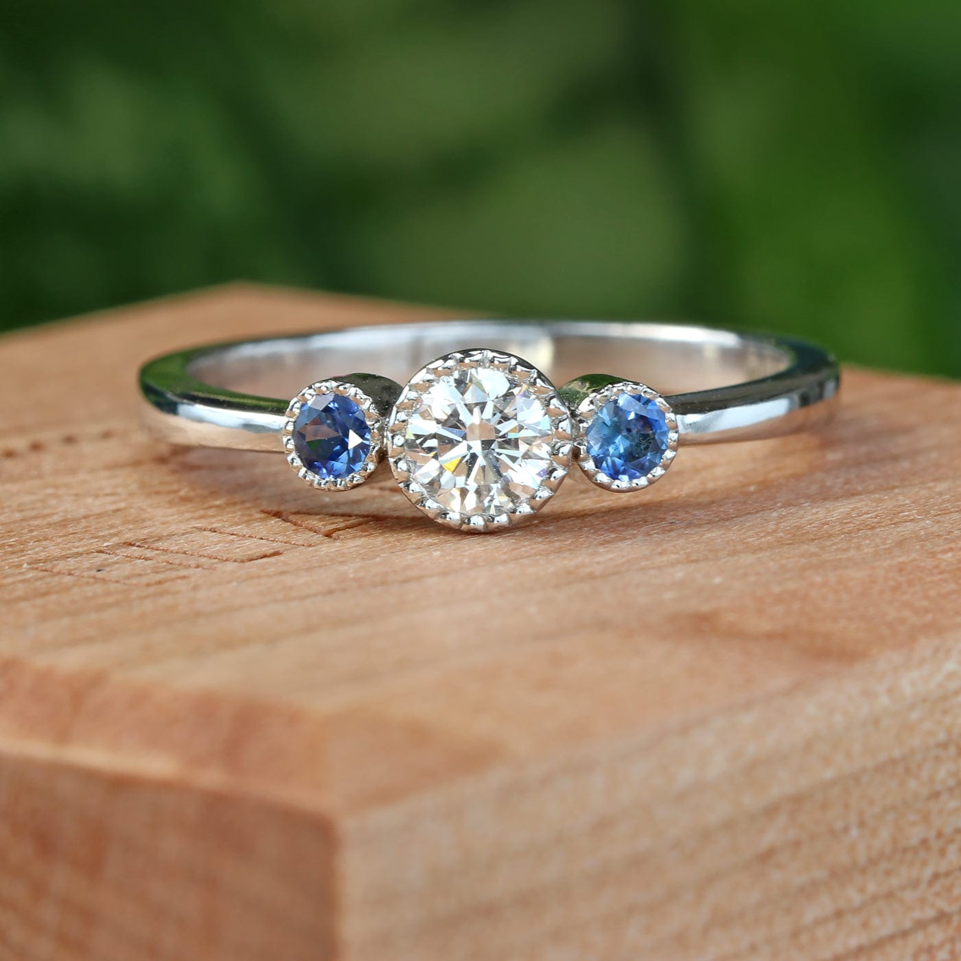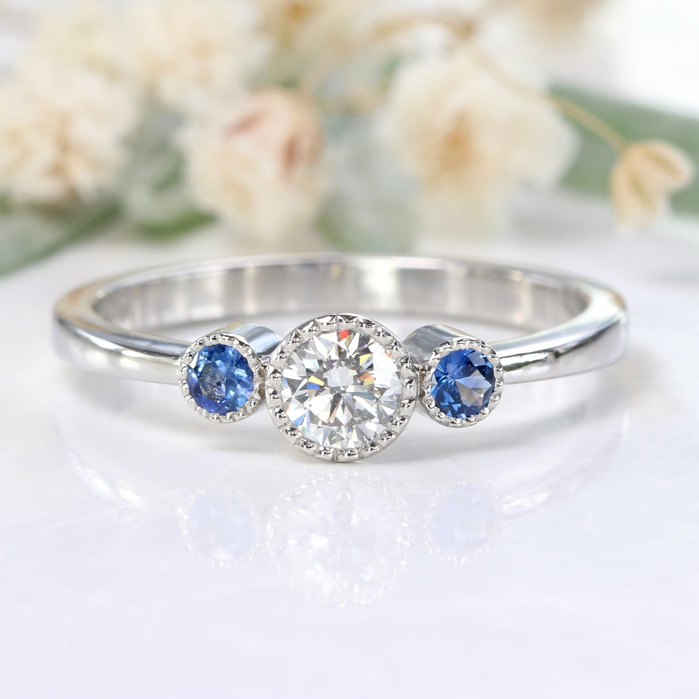 This exquisite engagement ring is set with a certified G colour, 4mm (0.25 carat) white diamond, with lovely sparkly and colour. The diamond is flanked by 2.5mm fair trade blue sapphires (mined in Montana, USA), with pretty milgrain detail around the gems. This ethical ring is handmade from solid 950 platinum. The band is 2mm wide, narrowing at the front.