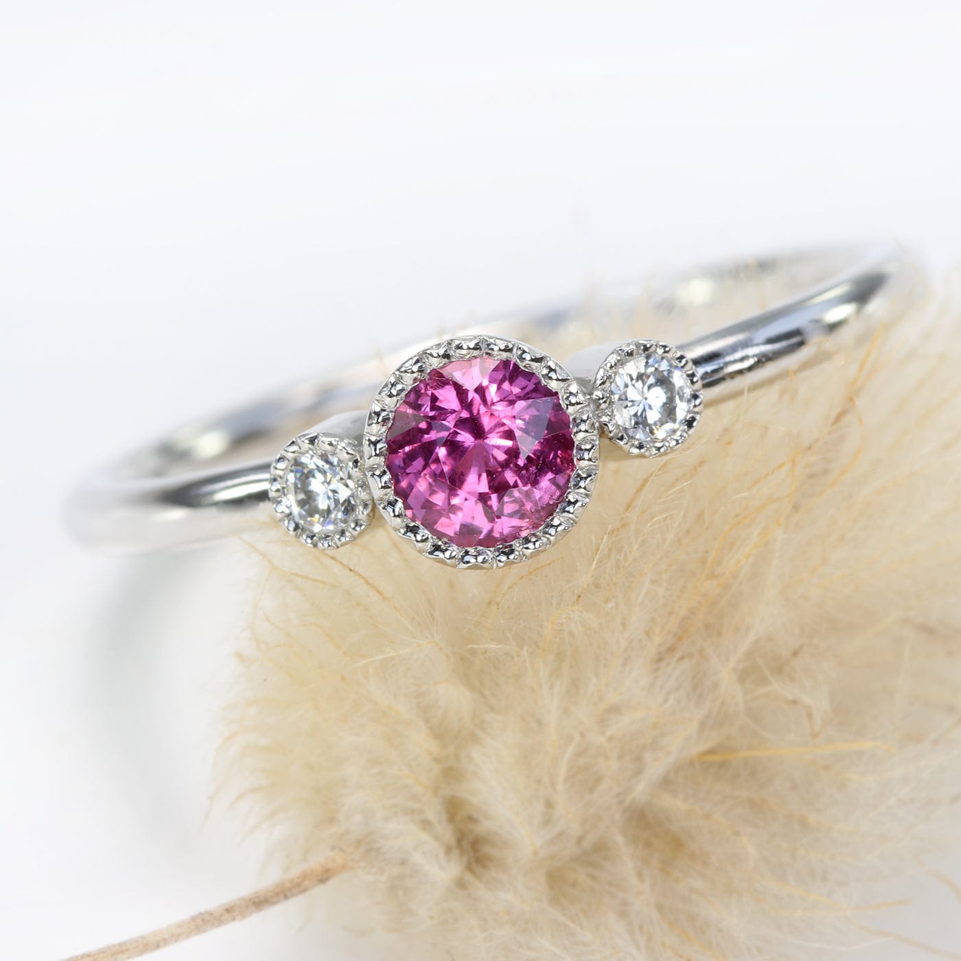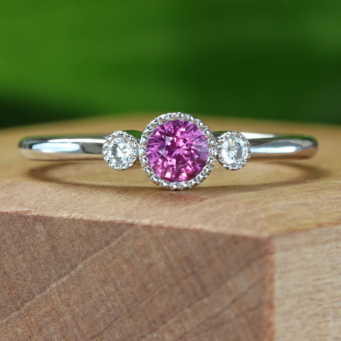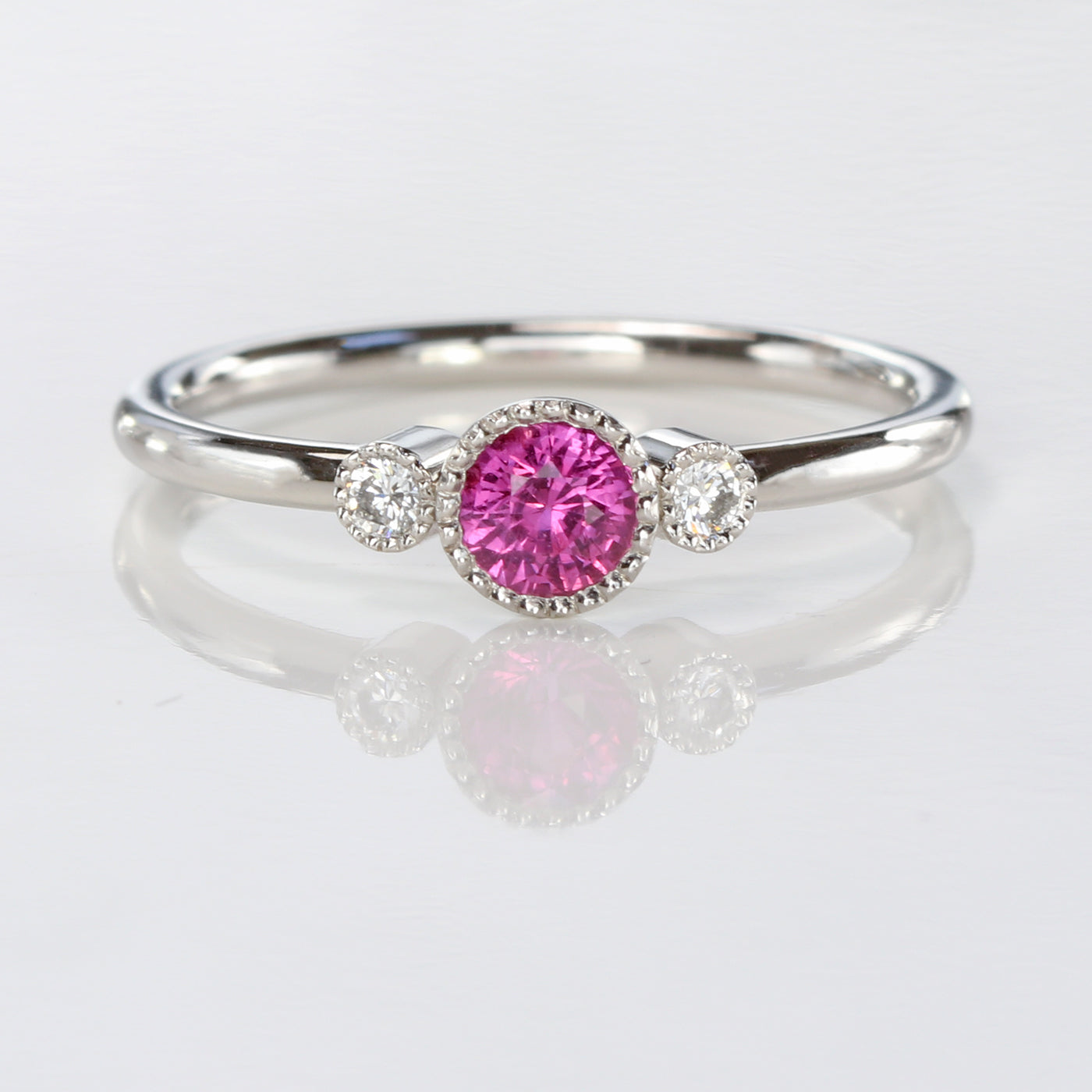 This handmade platinum pink sapphire and diamond trilogy engagement ring features a vivid natural pink sapphire at the centre of a petite three-gem design. The sapphire weighs 0.32 carats, measures 4.2 mm and is completely natural and unheated — a rarity that means its vibrant hot-pink colour is exactly as it was formed in the earth.