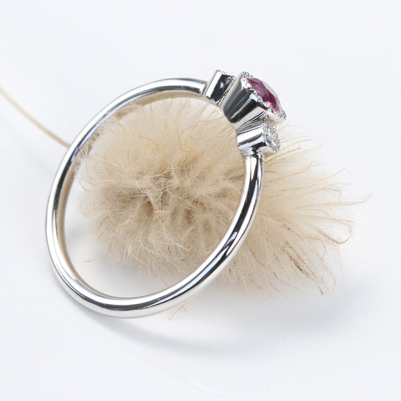 On either side sit two bright Canadian diamonds in milgrain-edged bezel settings, providing a crisp contrast that highlights the sapphire’s colour. The slim 1.5 mm band is made from recycled 950 platinum and has a comfortable halo profile, giving the ring a delicate, refined feel while still being strong enough for everyday wear.