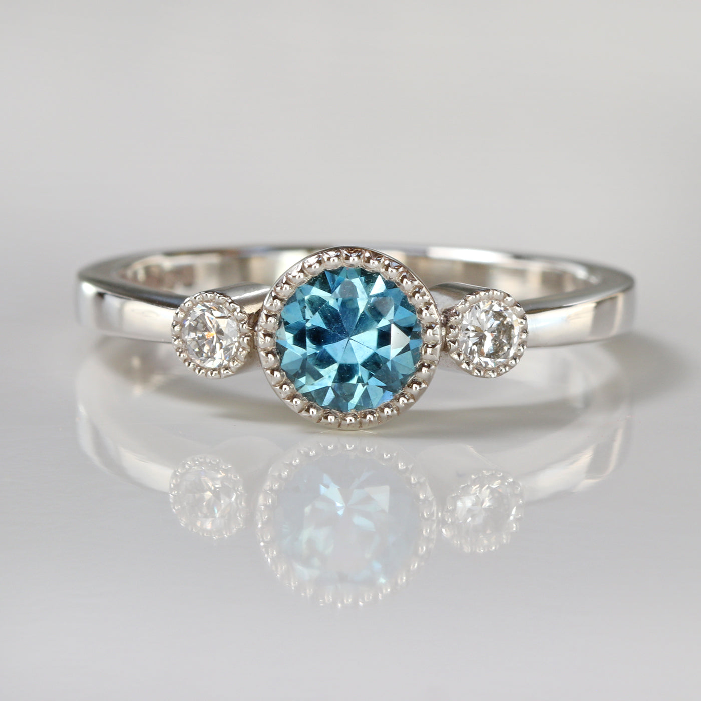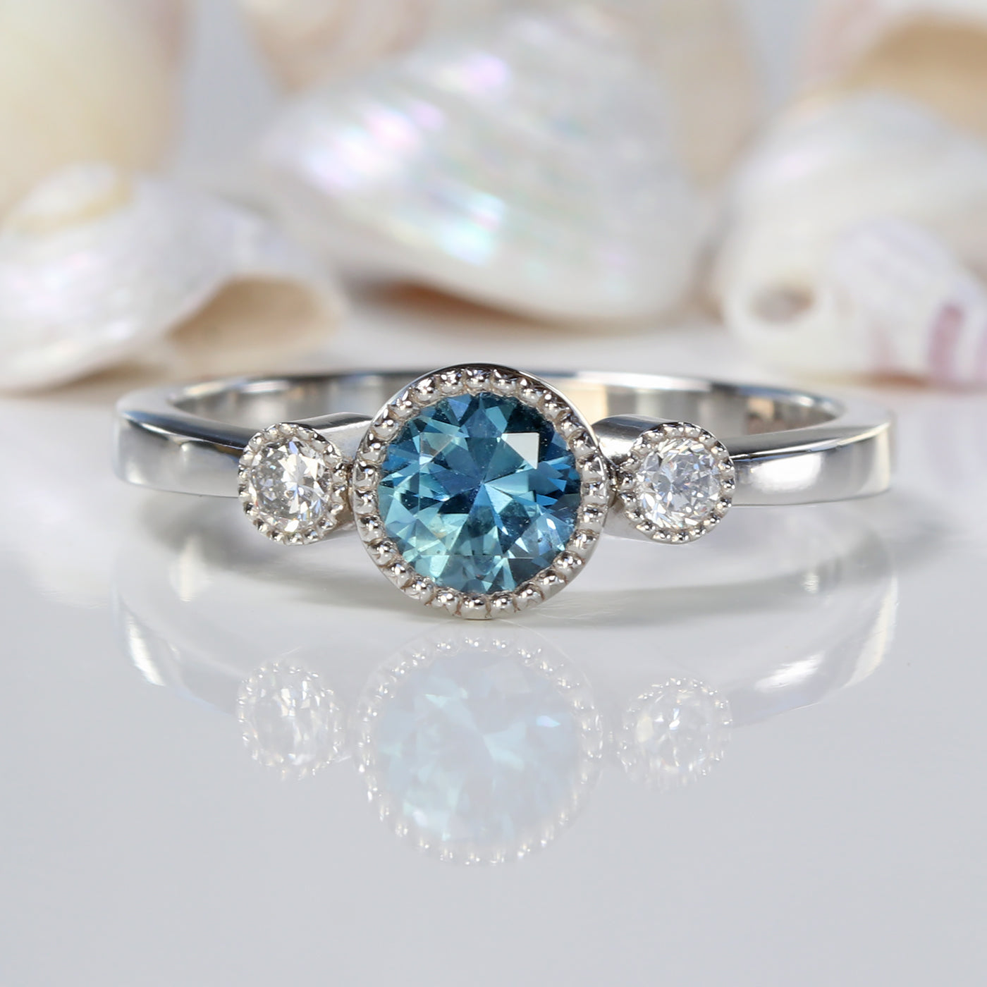 Kerenza Handmade Platinum Teal Sapphire Trilogy Engagement Ring