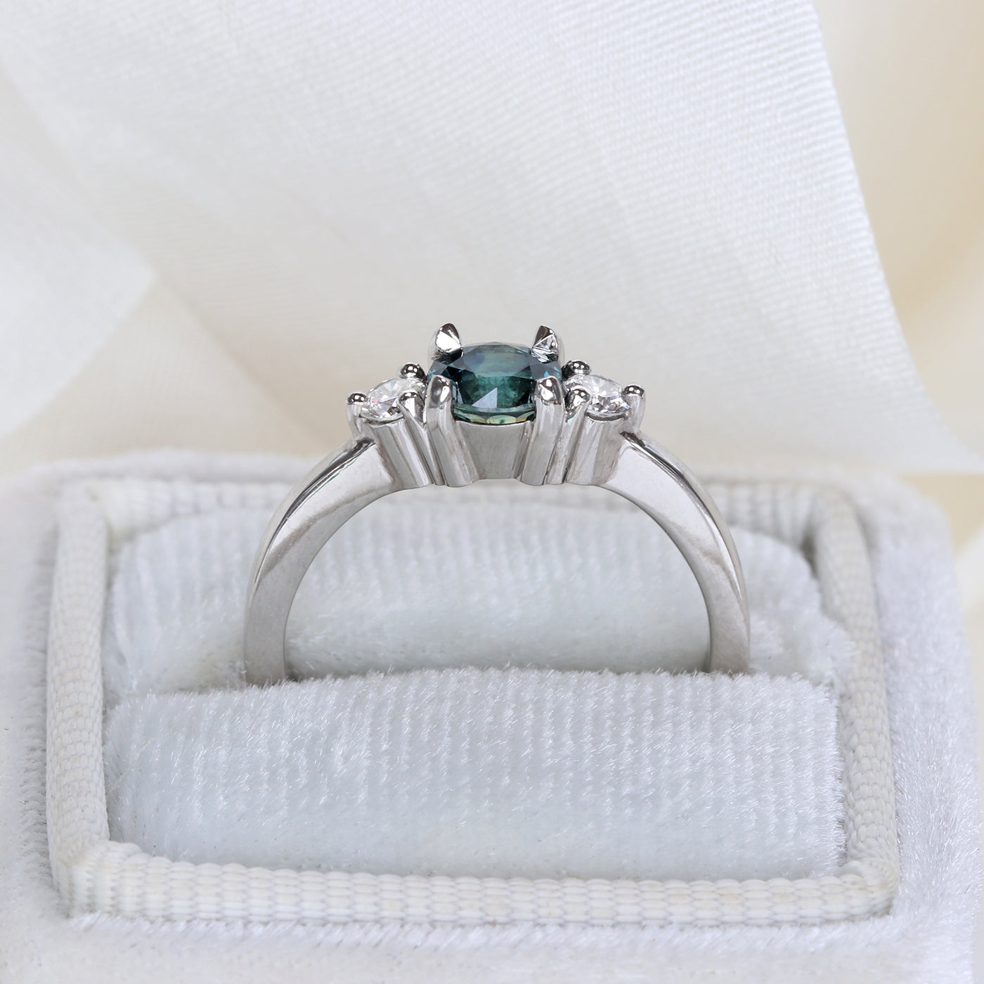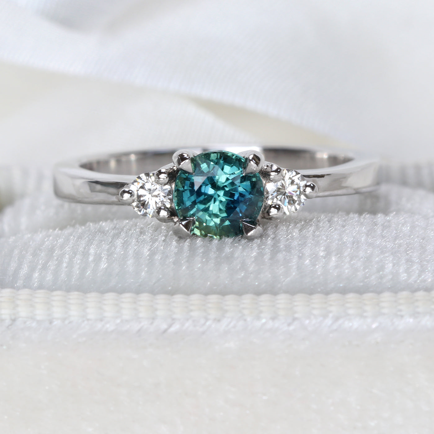 Lamorna Handmade Platinum Teal Sapphire Trilogy Engagement Ring