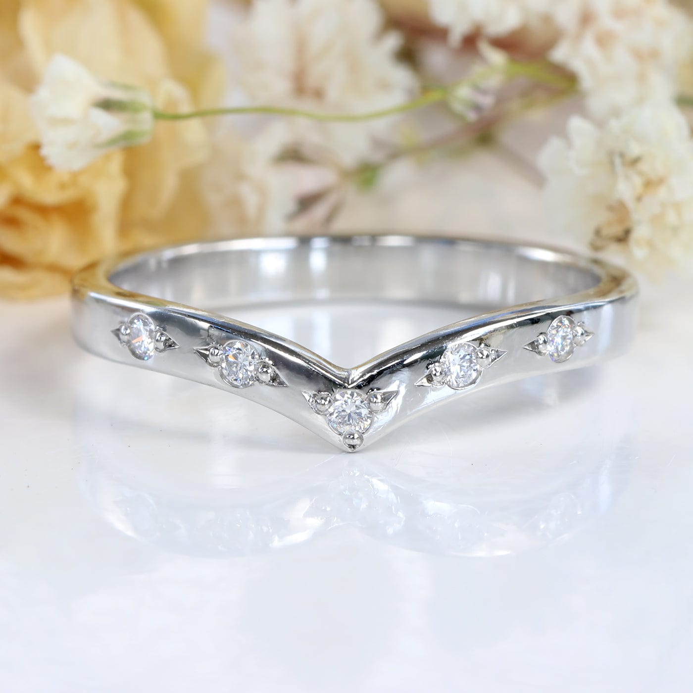 A stylish wishbone eternity or wedding ring, handmade from ethically sourced solid 950 platinum. The ring features five 1.5mm fair trade Canadian diamonds with pretty bead set detail holding the stones. The 2.5mm band is slightly wider than our other wishbone rings, giving the ring more presence on the finger.