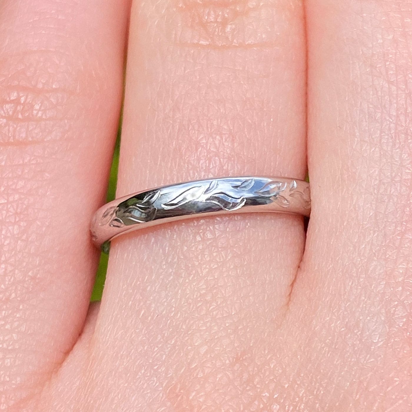 This floral platinum wedding ring has a leaf pattern, expertly hand engraved, all around the band. The 3mm wide comfort fit (or court) shape band has been handmade from recycled solid 950 platinum, using traditional jewellery making techniques at the Lilia Nash Jewellery Studio in Calstock, Cornwall.