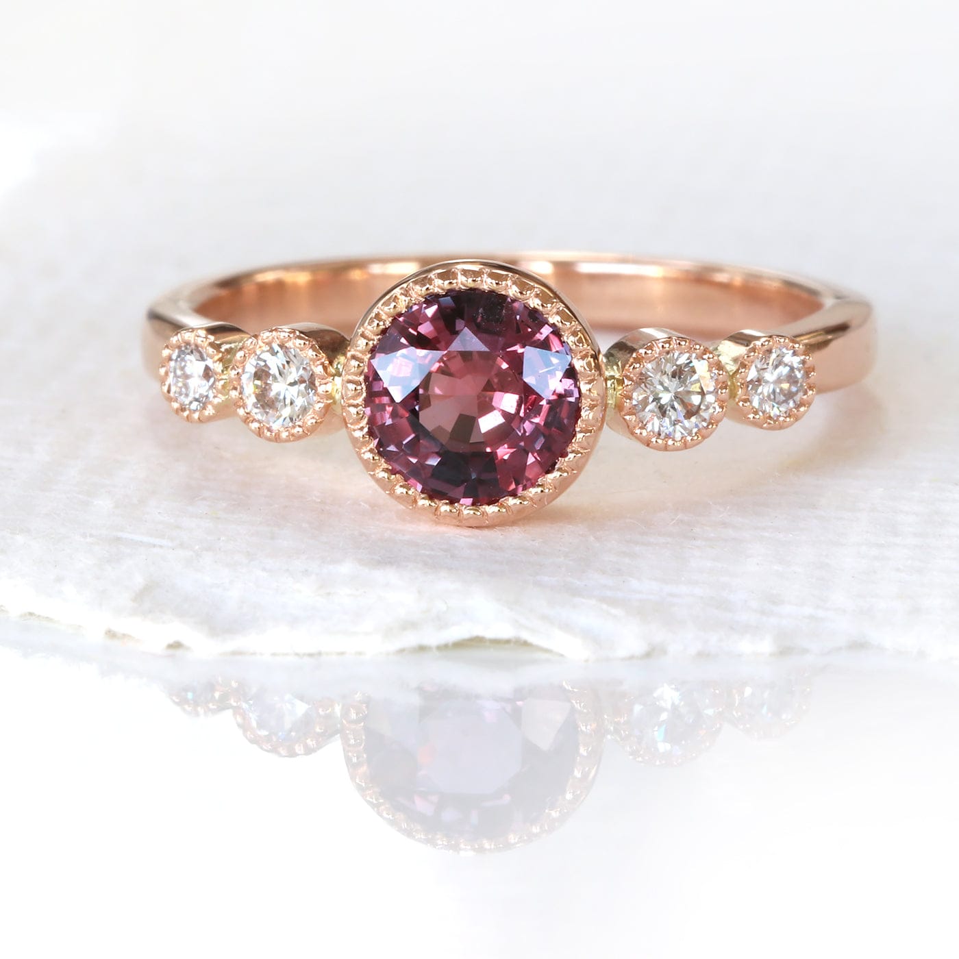 A bespoke design created by Lilia Nash using a beautiful 0.93ct pink sapphire. Solid 18ct rose gold engagement ring, set with two 2.5mm and two 2mm fair trade Canadian diamonds and a unheated 5.8mm 0.93 carat sapphire.