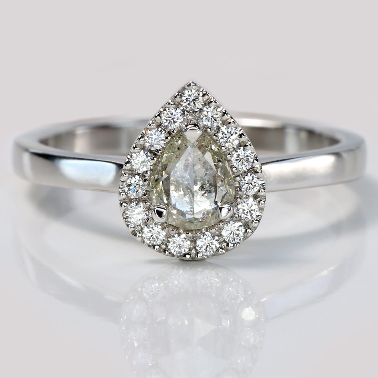 This handmade platinum pear diamond halo engagement ring contrasts a natural off-white rose cut diamond with the sparkle of a pavé halo. The central fully traceable diamond was mined in Botswana and measures 5.6 × 4.6 mm, weighing 0.4 carats (estimated K–L colour, I2 clarity).