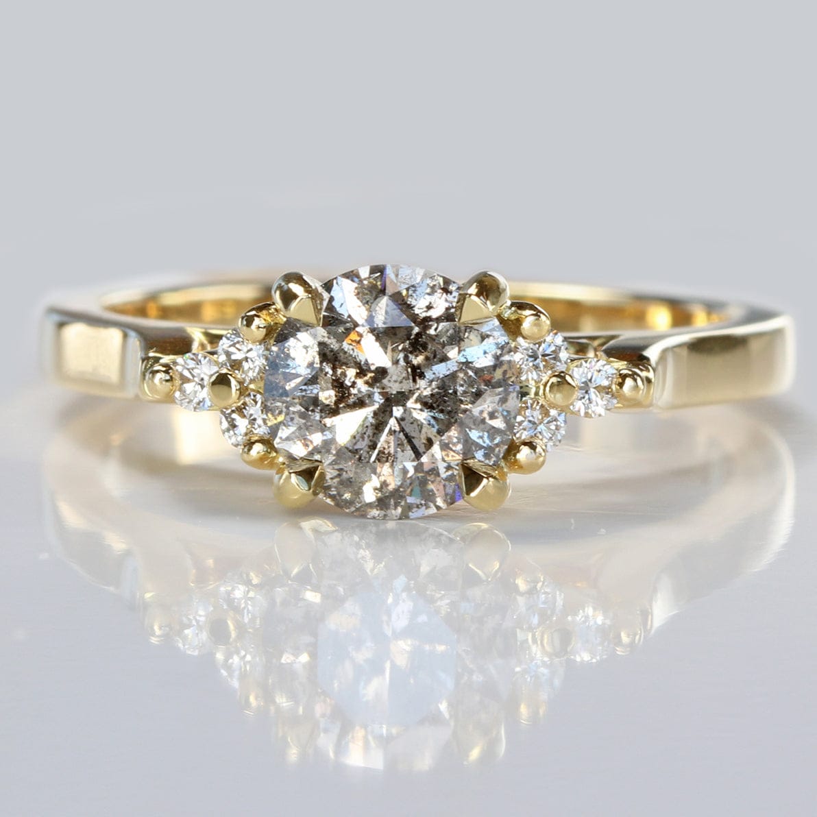 This handmade 18ct gold cluster engagement ring is set with a 1.09 carat salt and pepper diamond measuring 6.5 mm. The diamond is completely natural, with a cut that reflects the light beautifully and gives the gem a soft, vintage mirror-like appearance.