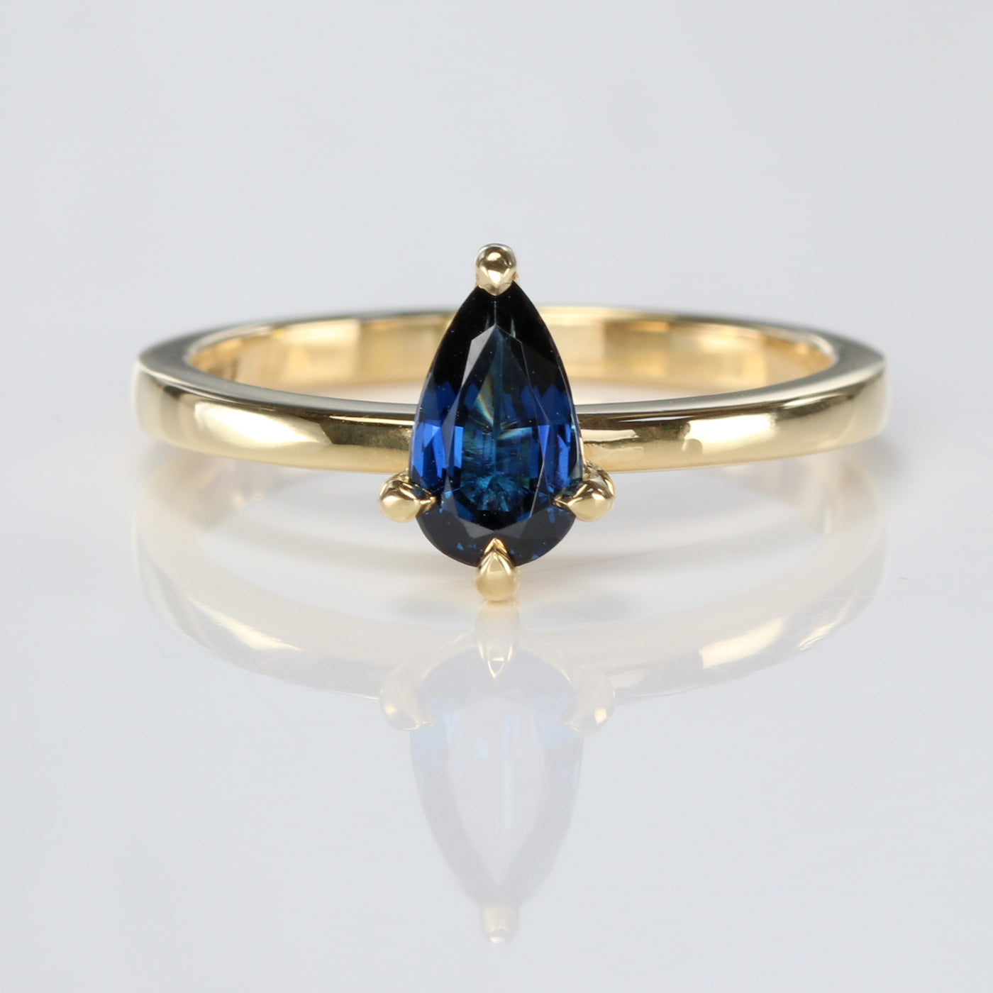 This handmade 18ct gold sapphire engagement ring features a pear cut sapphire in a rich deep blue tone. The deep blue sapphire weighs 0.8 carats and measures 7.7 mm by 4.5 mm, with a velvety colour that shows subtle flashes of brightness as the light moves across the gemstone.