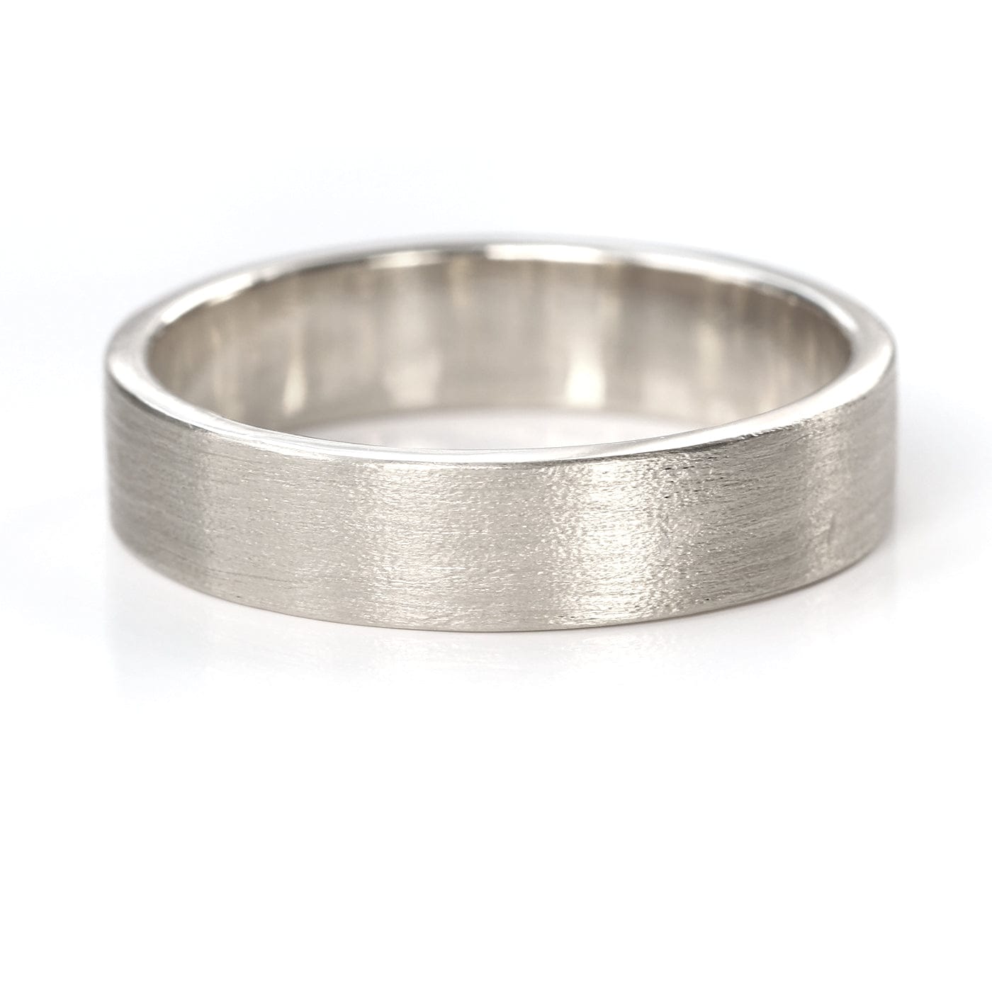 This contemporary 5mm wide flat profile wedding ring is made from ethical 950 platinum. The featured wedding ring has been given Lilia's signature spun silk finish, with polished edges. Please add a note to your order if you'd like to modify the available finishes with polished edges, or contact us to further customise the design with our bespoke wedding ring design service.
